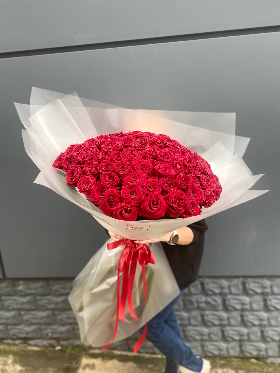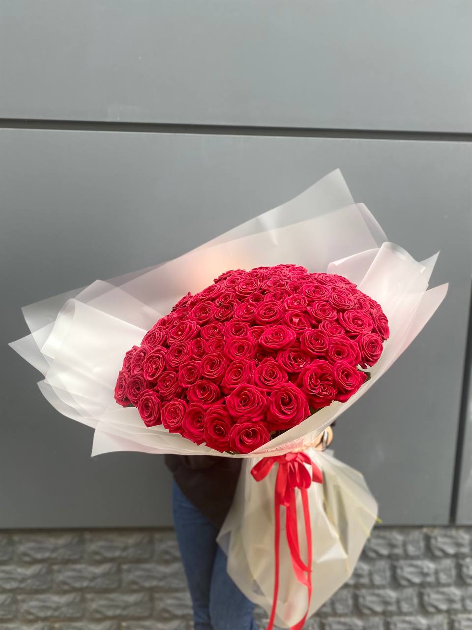 Сто одна белоснежная роза из Кении собрана в монохромную композицию с безупречной геометрией. Каждый бутон держит форму и создаёт плотное облако света. Для момента когда слова не нужны.