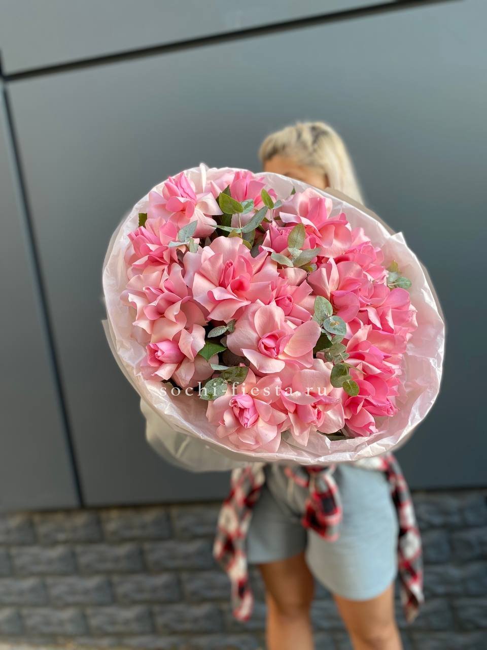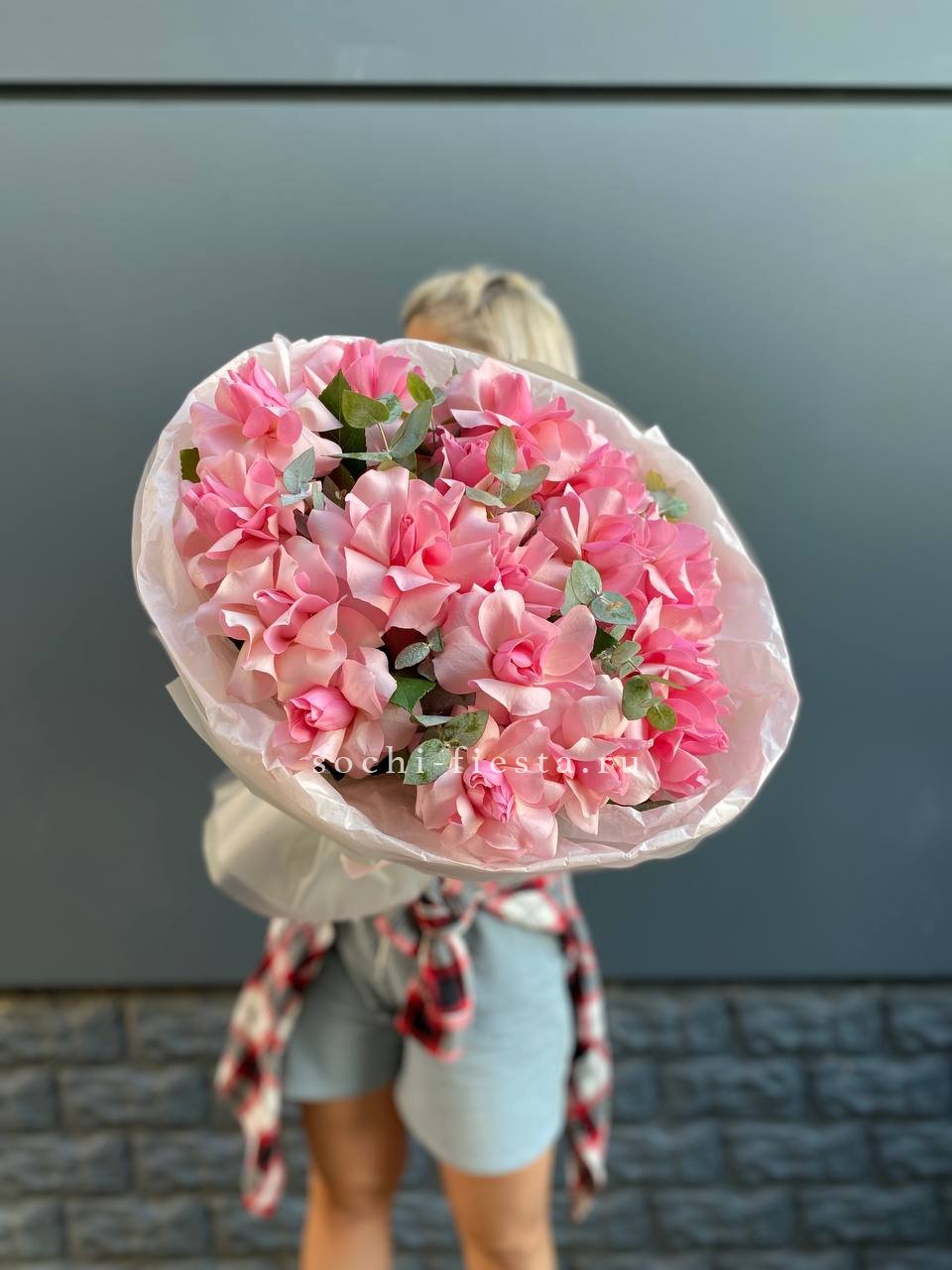 Одиннадцать французских роз выстроены в округлую композицию с веточками эвкалипта. Бутоны крупные и плотные, держат форму и наполняют пространство свежим присутствием.