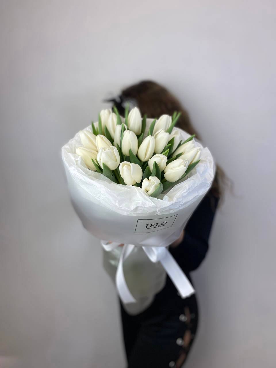 Девятнадцать белых тюльпанов собраны в плотный монобукет с ровными линиями и чистым силуэтом. Белизна лепестков создаёт ощущение света и пространства.