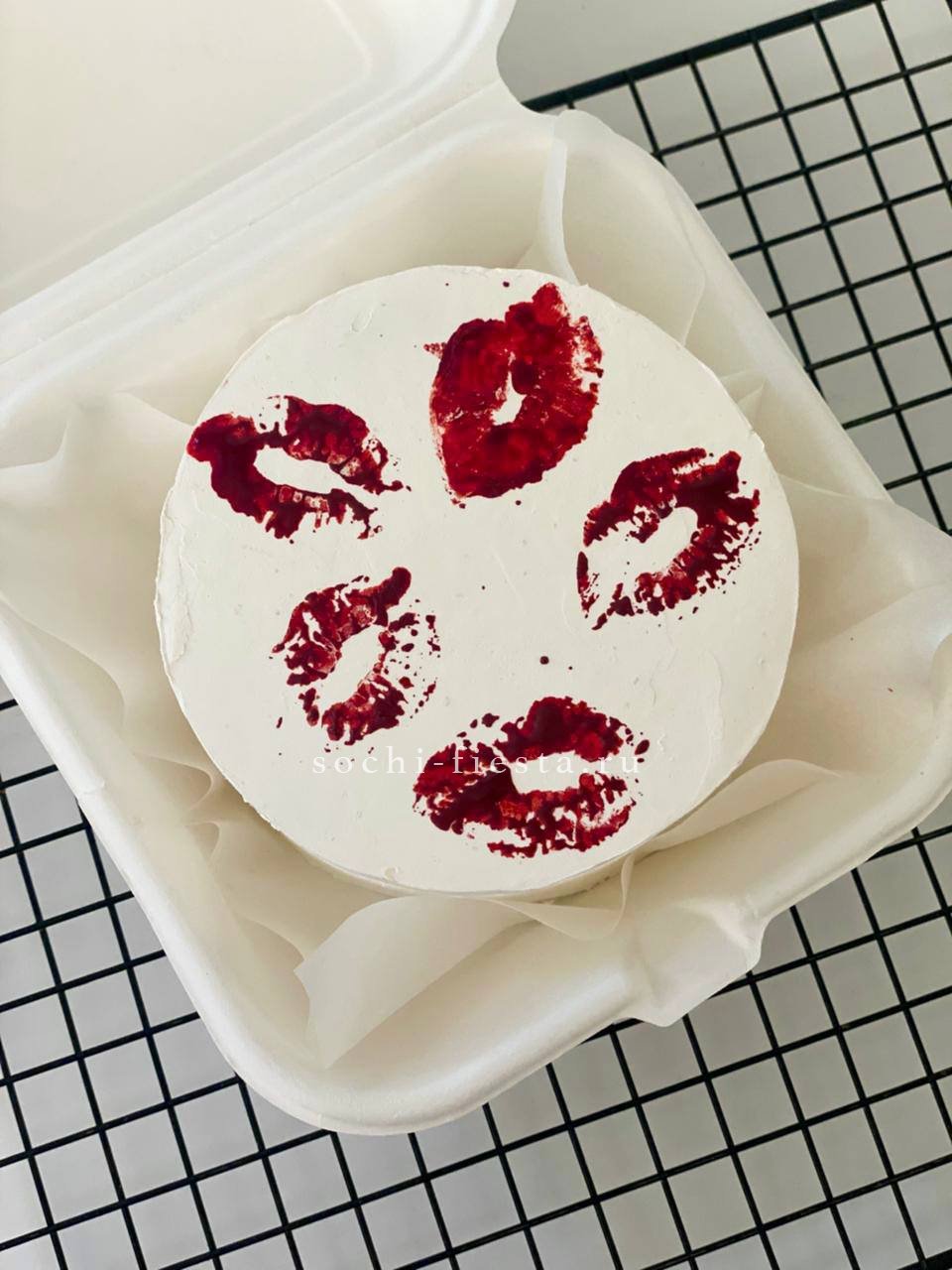 Миниатюрный десерт с яркой помадкой и графичным рисунком губ в стиле поп-арт. Крем держит форму, коржи пропитаны, а декор радует глаз даже через прозрачную крышку. Достаточно для двоих или для одного сладкого вечера.