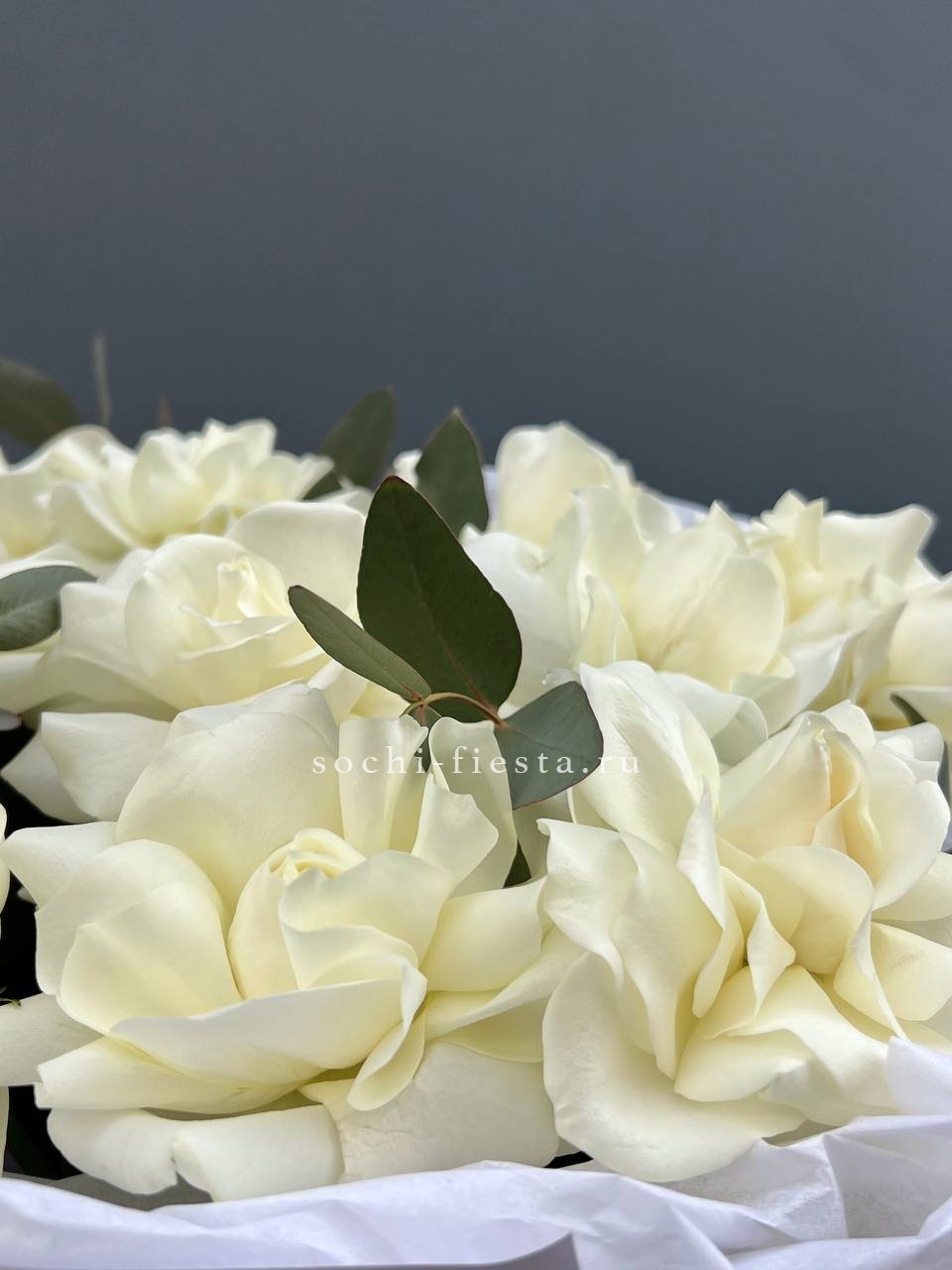Пышная композиция в круглом боксе объединяет розы, эустому, хризантемы и диантус в плотную цветущую массу. Бомбастик добавляет объёма, а эвкалипт смягчает переходы между соцветиями. Готовое решение для размещения на столе или комоде.