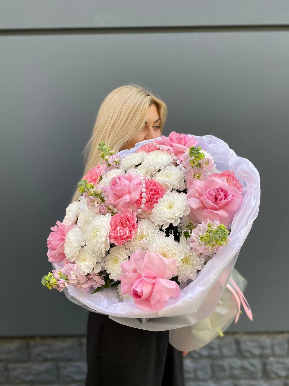 Хризантемы и розы соединяются с диантусами и маттиолой в яркой композиции. Декоративные бусины вплетаются в оформление и задают игривое настроение всему букету.