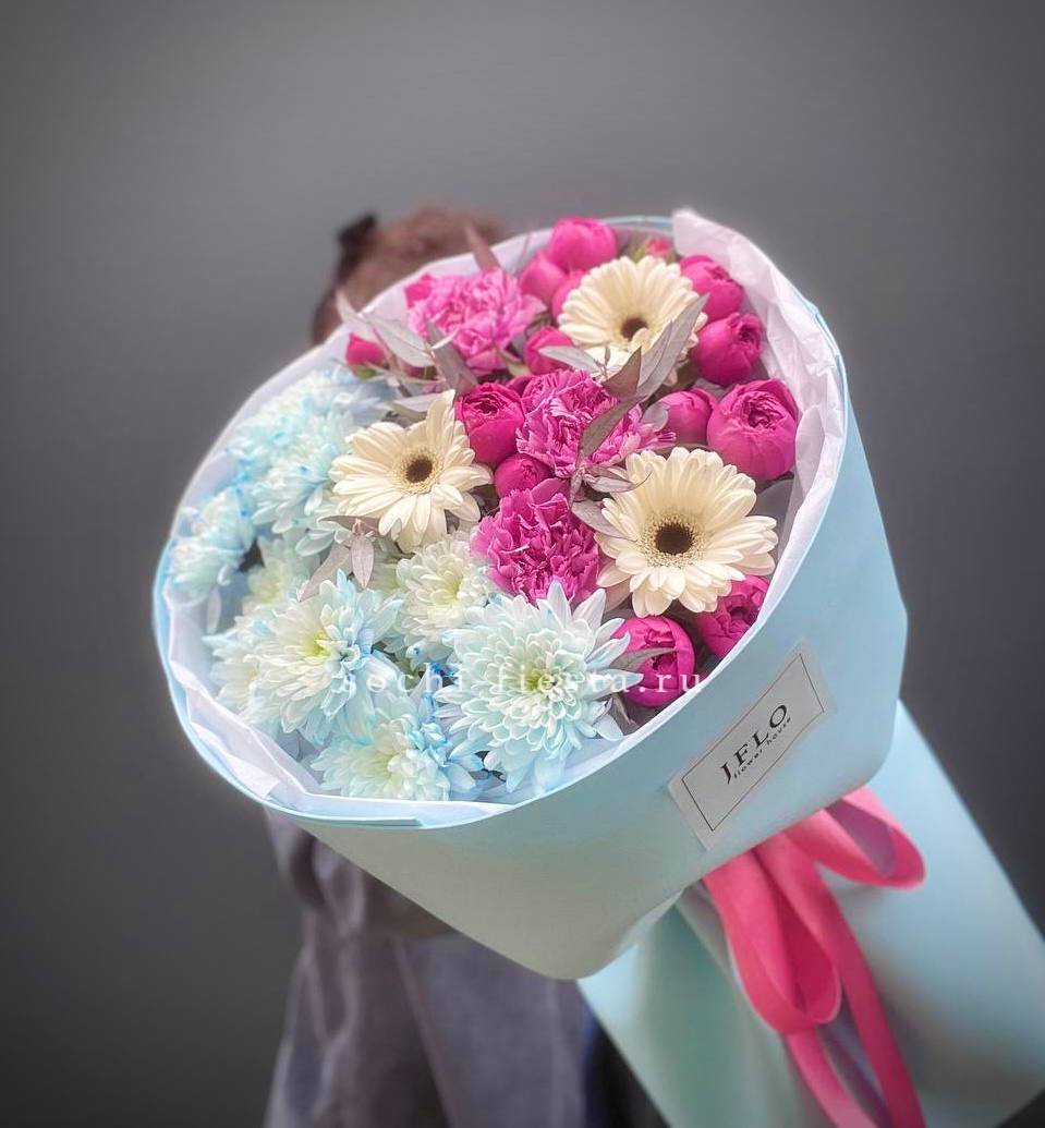 хризантемы кустовая, геребры, диантусы, пионовидные розы Мисти Бабблс, эвкалипт,  лента, упаковка.