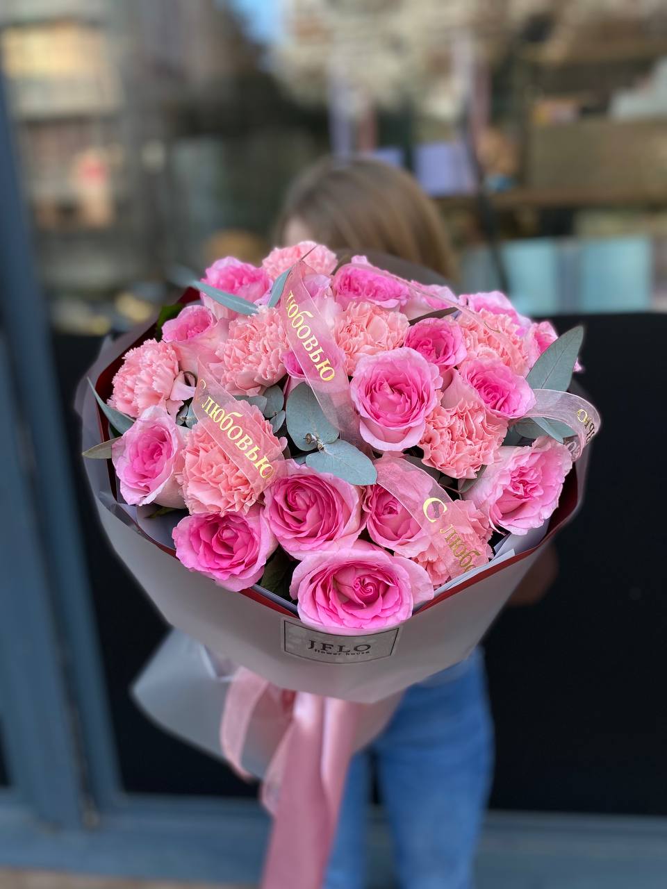 Розовые розы собраны плотной полусферой, где каждый бутон раскрывается навстречу свету. Диантусы добавляют воздушности, а эвкалипт мягко обрамляет композицию. Букет, который говорит без слов.