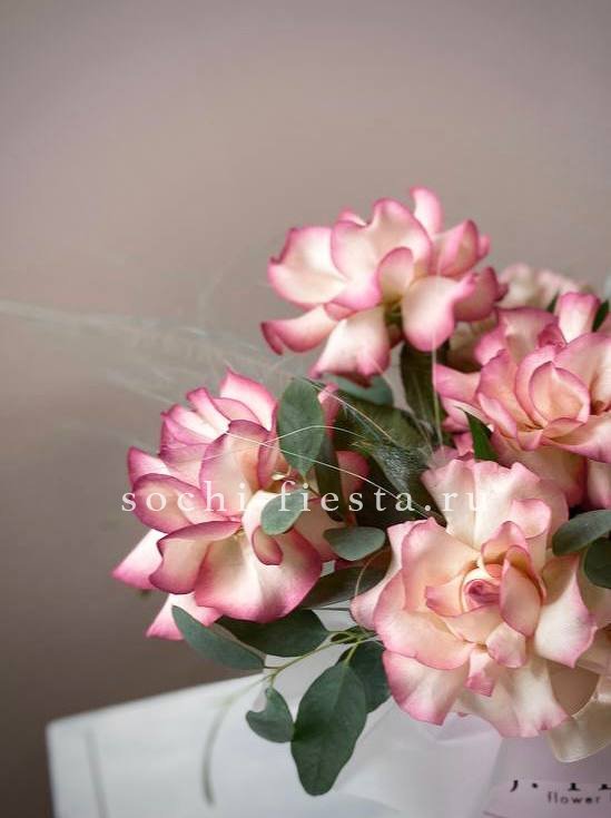 розовые розы, диантусы с эвкалиптом в нежном оформлении.