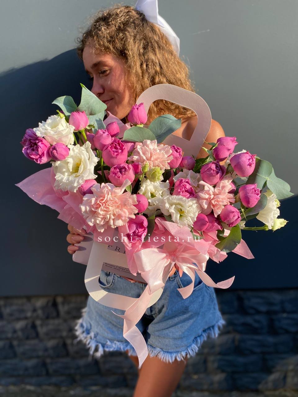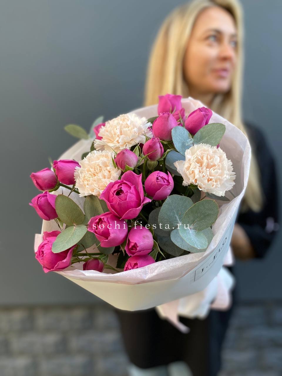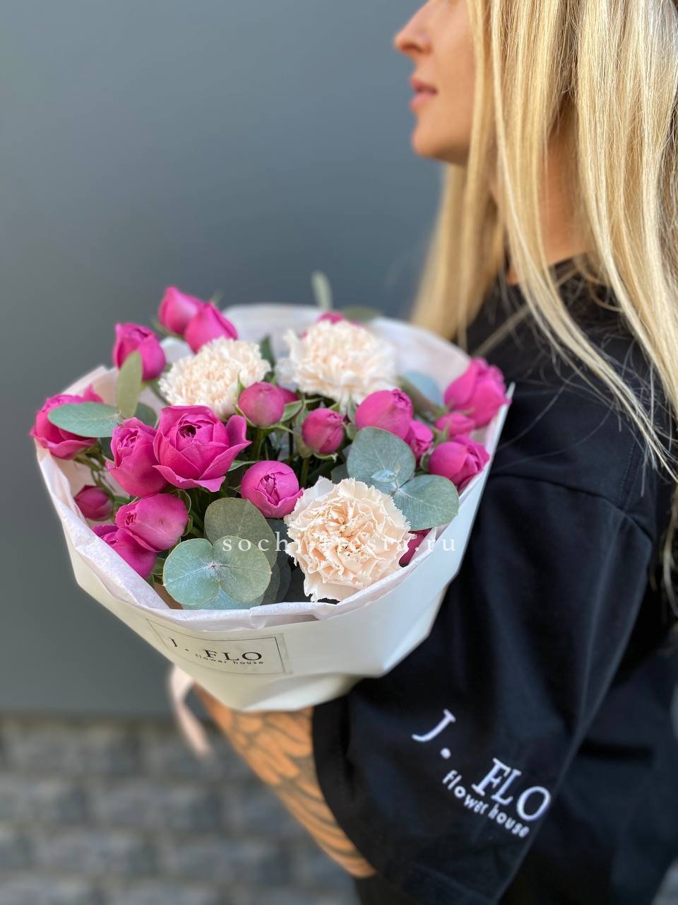Воздушные кисти мисти бабблс переплетаются с яркими диантусами создавая объёмную текстуру. Эвкалипт добавляет свежести и завершает композицию лёгкими зелёными нотами.