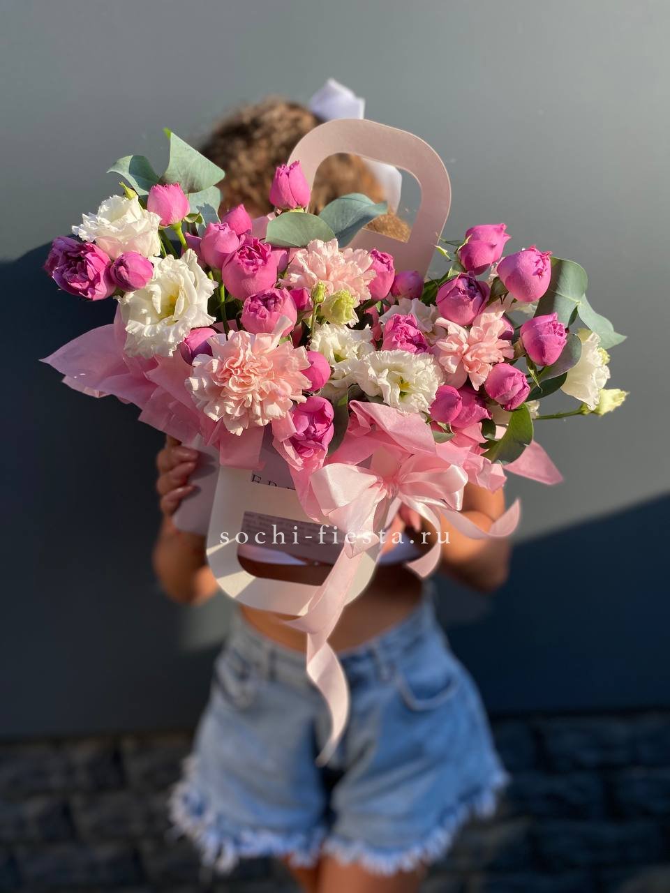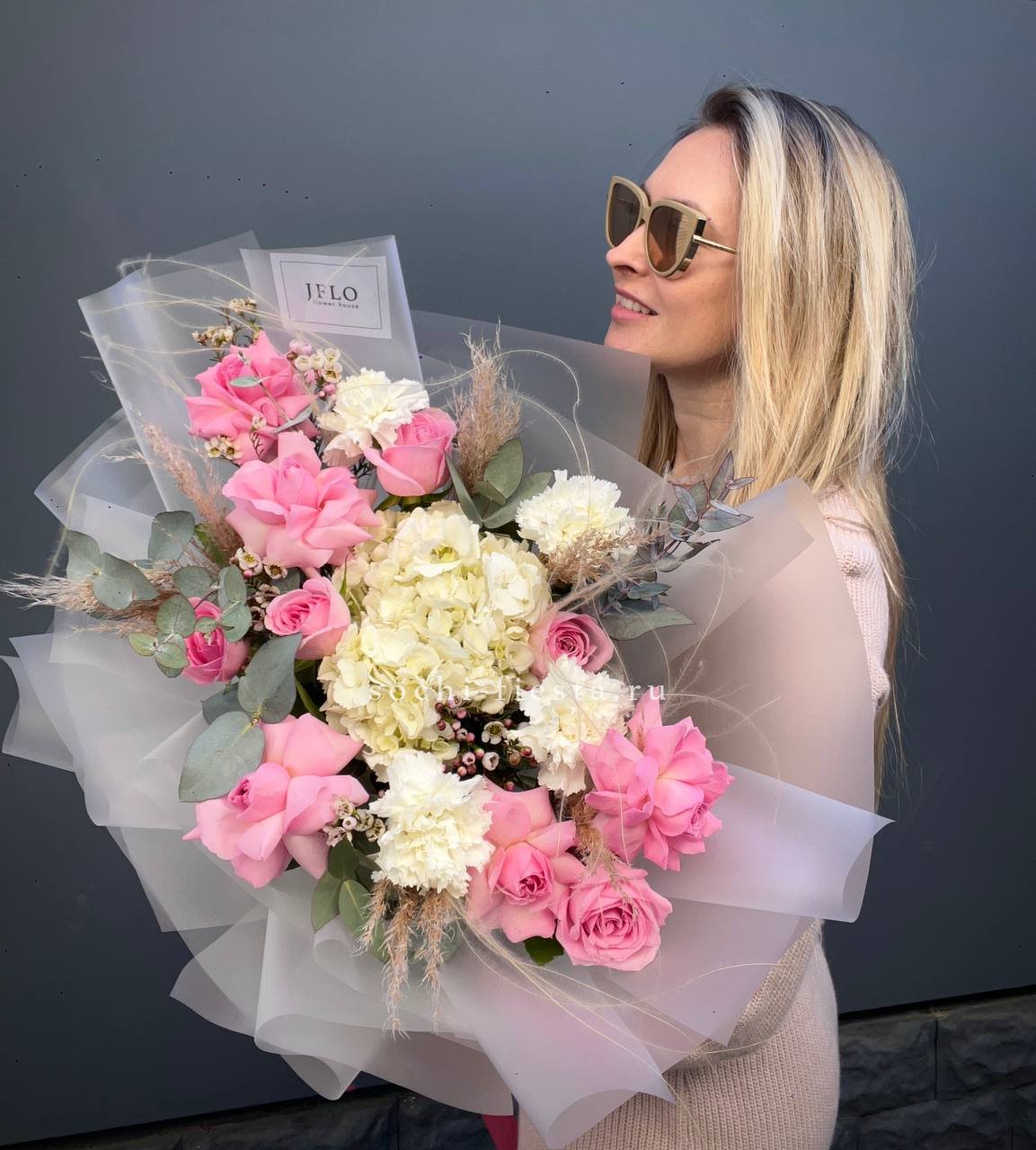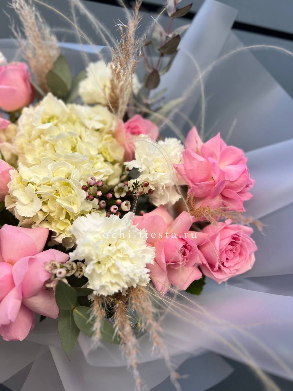 Воздушные кисти мисти бабблс переплетаются с яркими диантусами создавая объёмную текстуру. Эвкалипт добавляет свежести и завершает композицию лёгкими зелёными нотами.