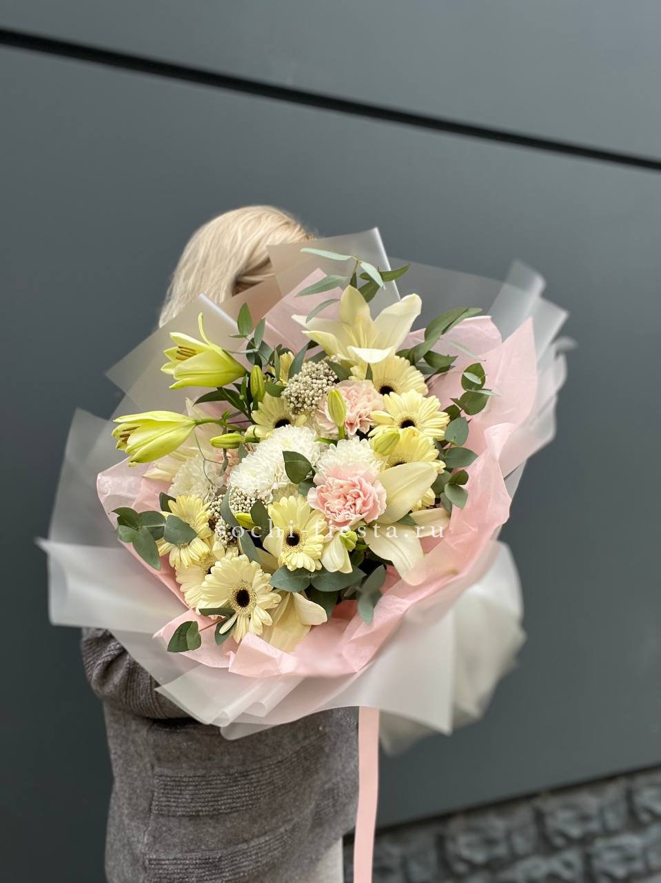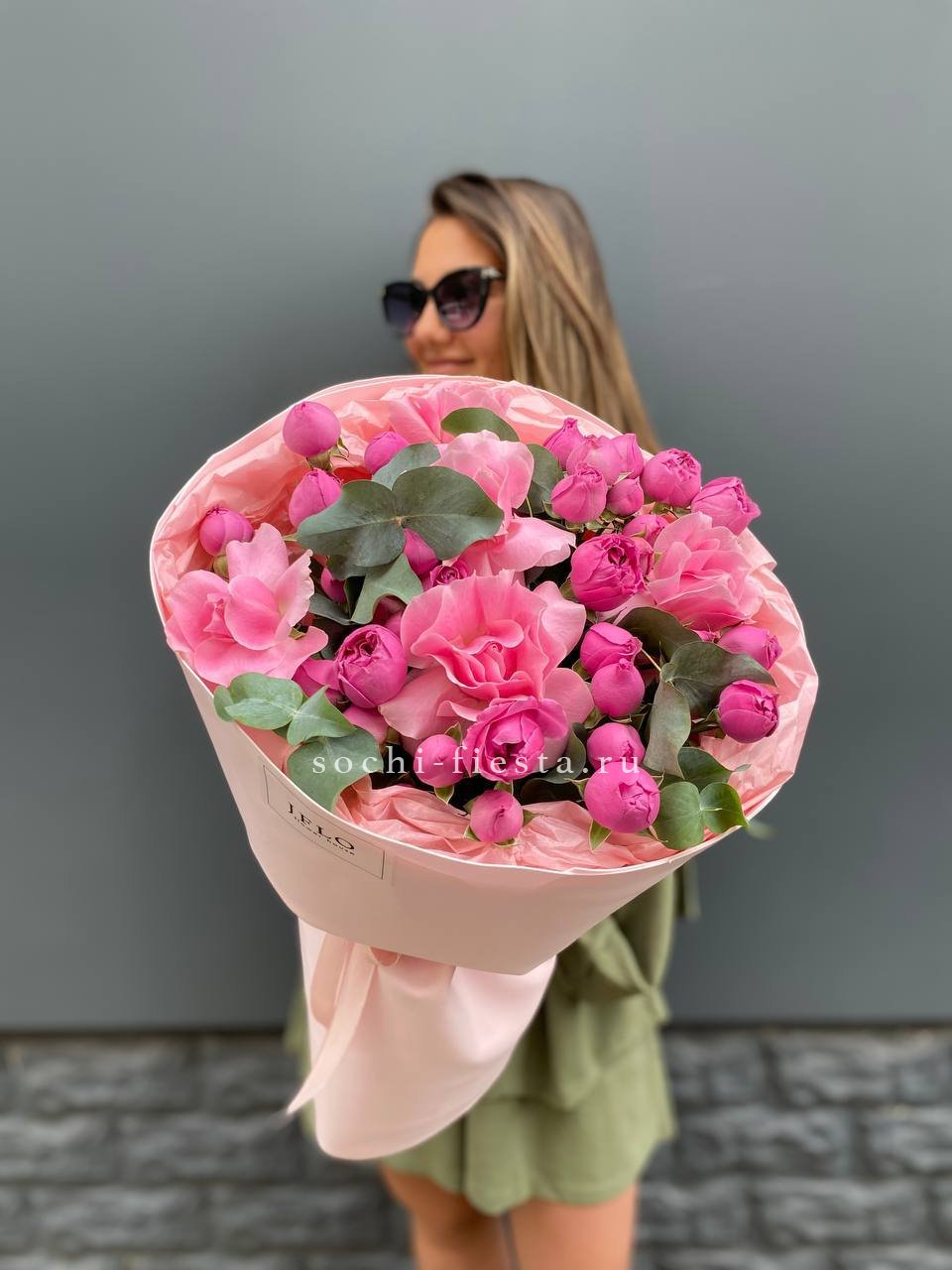 Розовая гамма раскрывается через махровые пионовидные бутоны и классические розы с плотной текстурой лепестков. Эвкалипт вплетается в композицию, создавая свежий акцент.