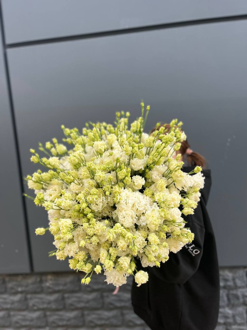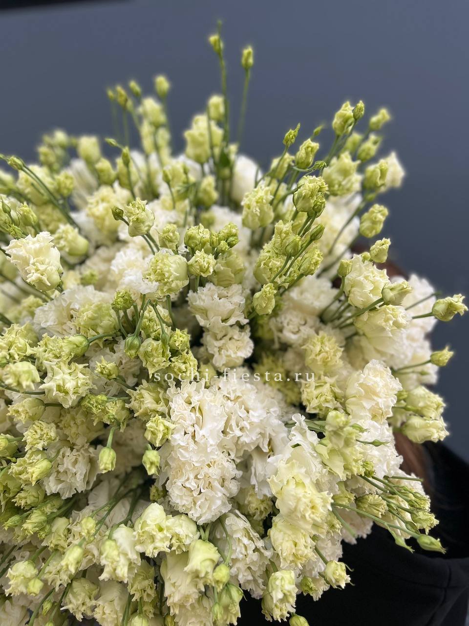 Пятнадцать воздушных эустом собраны в пудровое облако с мягкими переходами оттенков. Многослойные бутоны создают объёмную текстуру и удивительную глубину композиции.