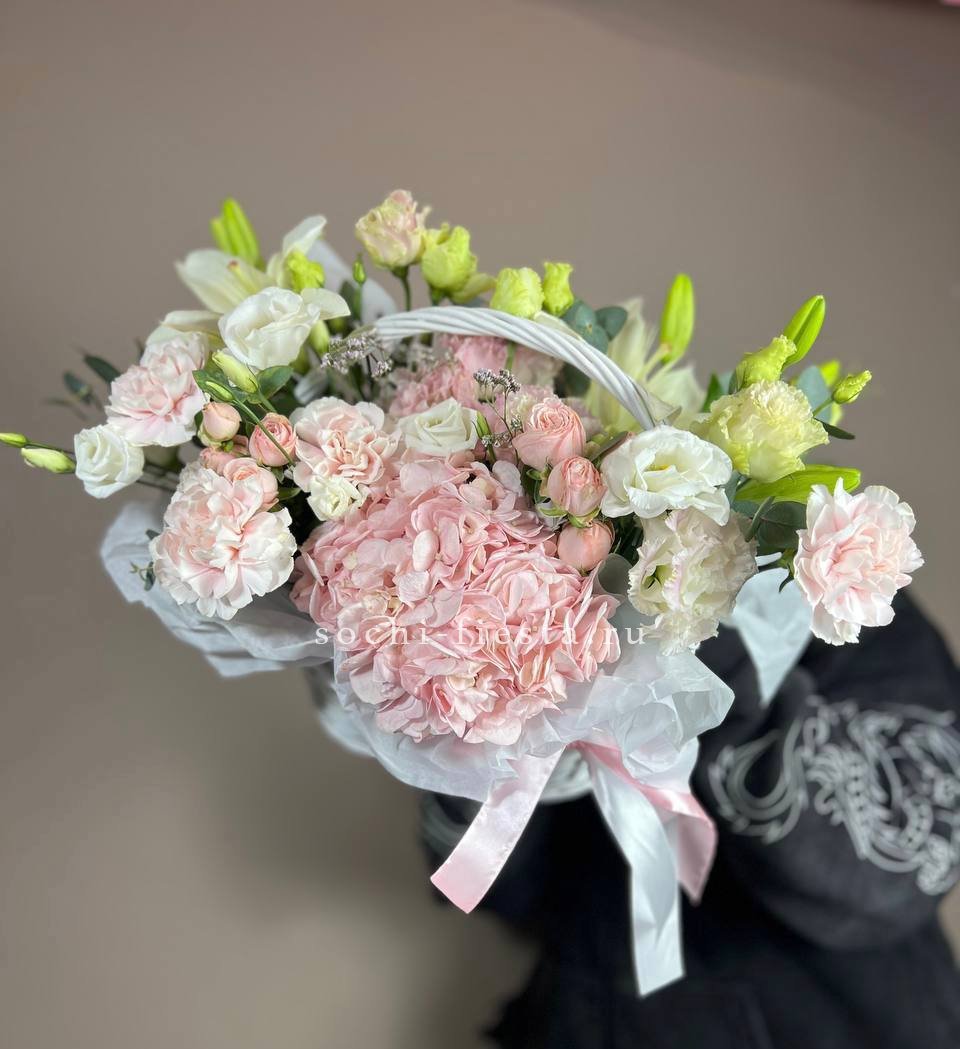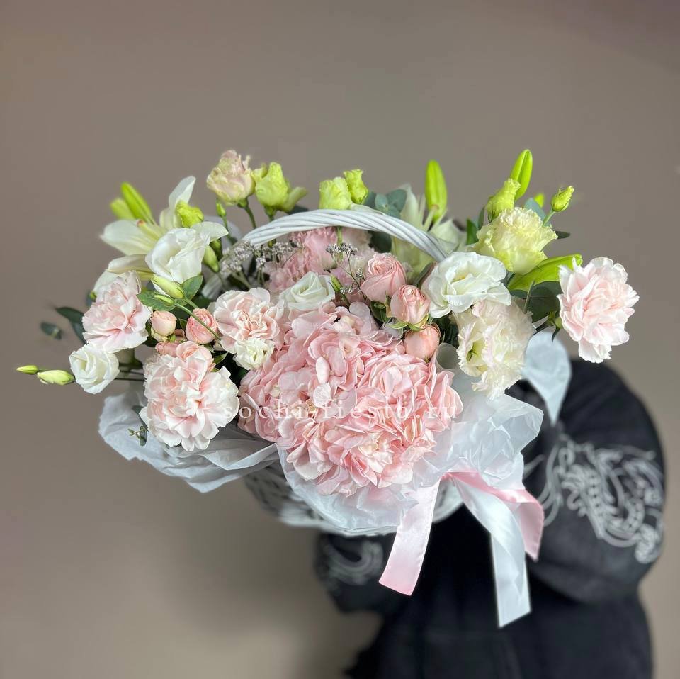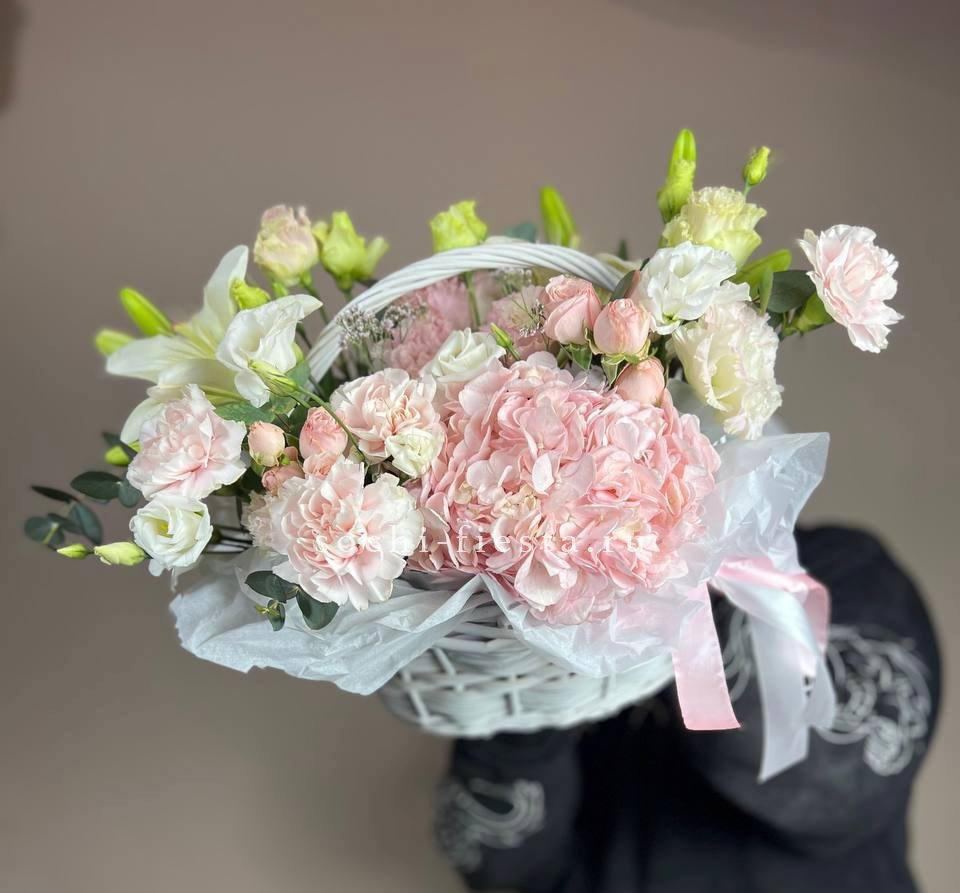 Пышная корзина с лилиями и гортензией собрана так, чтобы каждый цветок был виден и раскрыт. Розовые оттенки бомбастика перетекают в лиловый лимониум, создавая мягкую градацию. Эустома и диантус добавляют воздушности, эвкалипт завершает форму.
