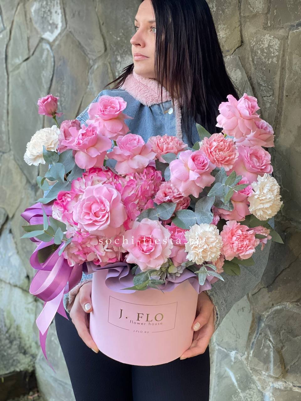 гортензия, эустома, диантусы, французские розы, эвкалипт, цилиндр D20.