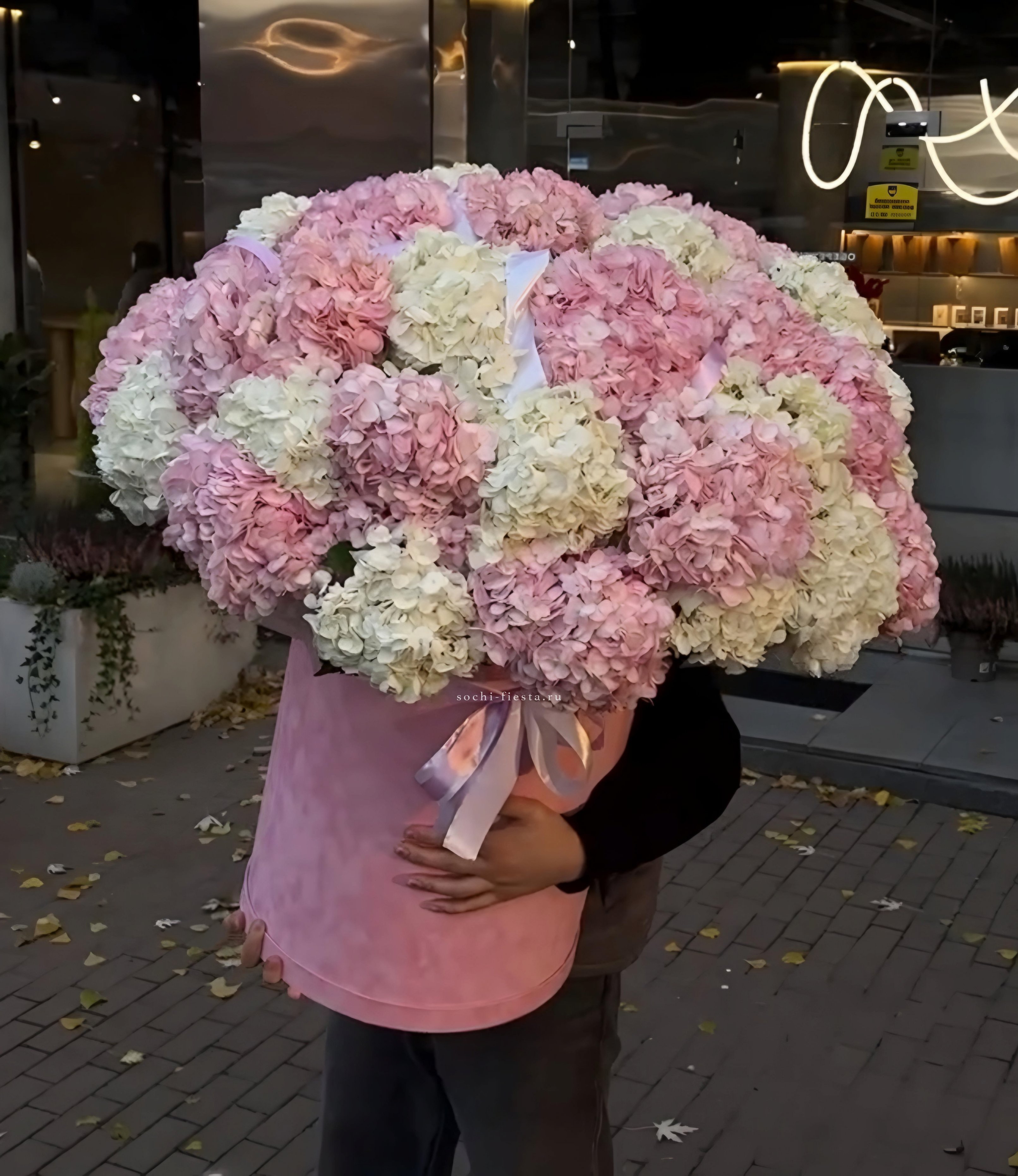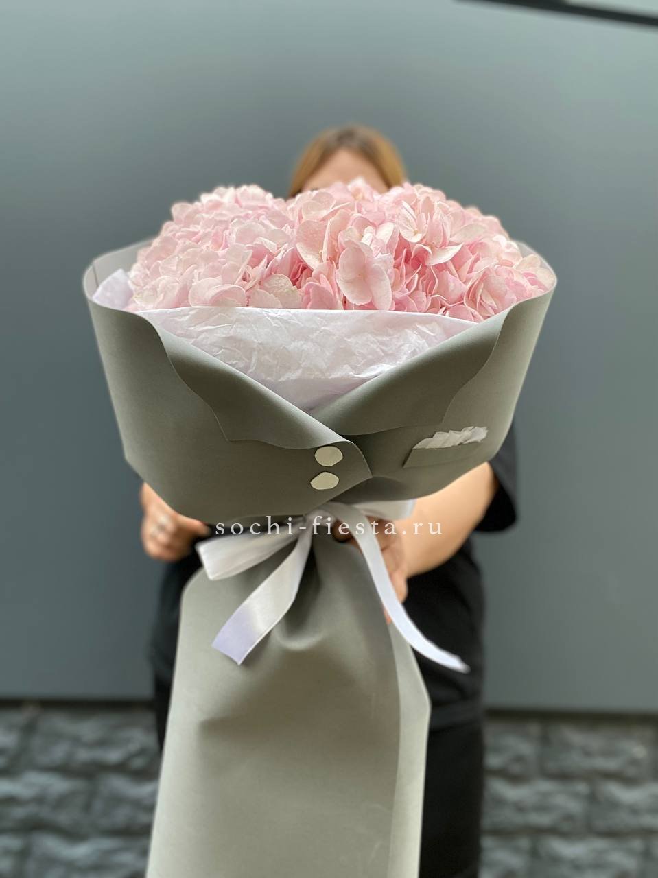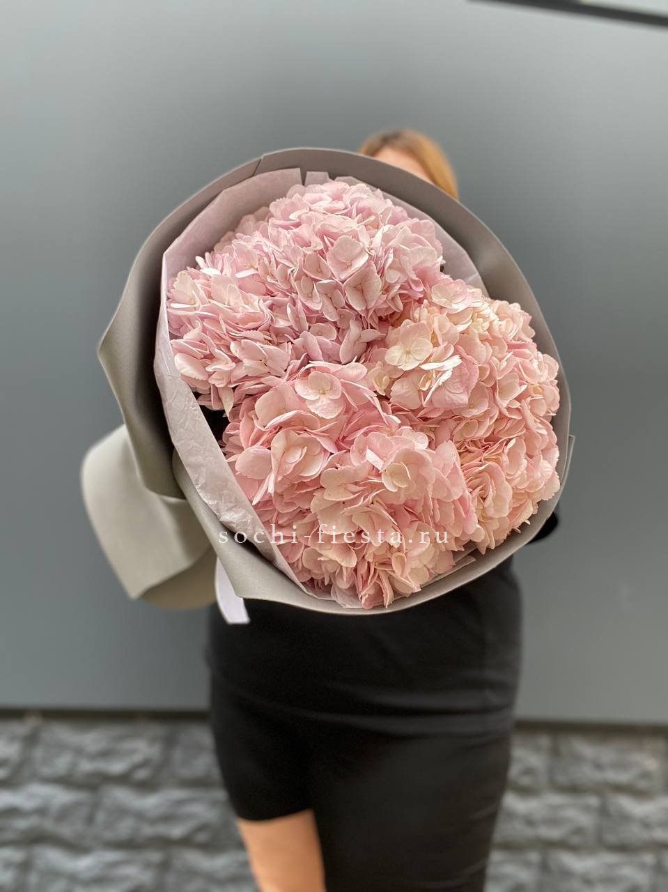 гортензия розовая 9шт., лента, дизайнерская упаковка. Цвет гортензий может незначительно отличаться.