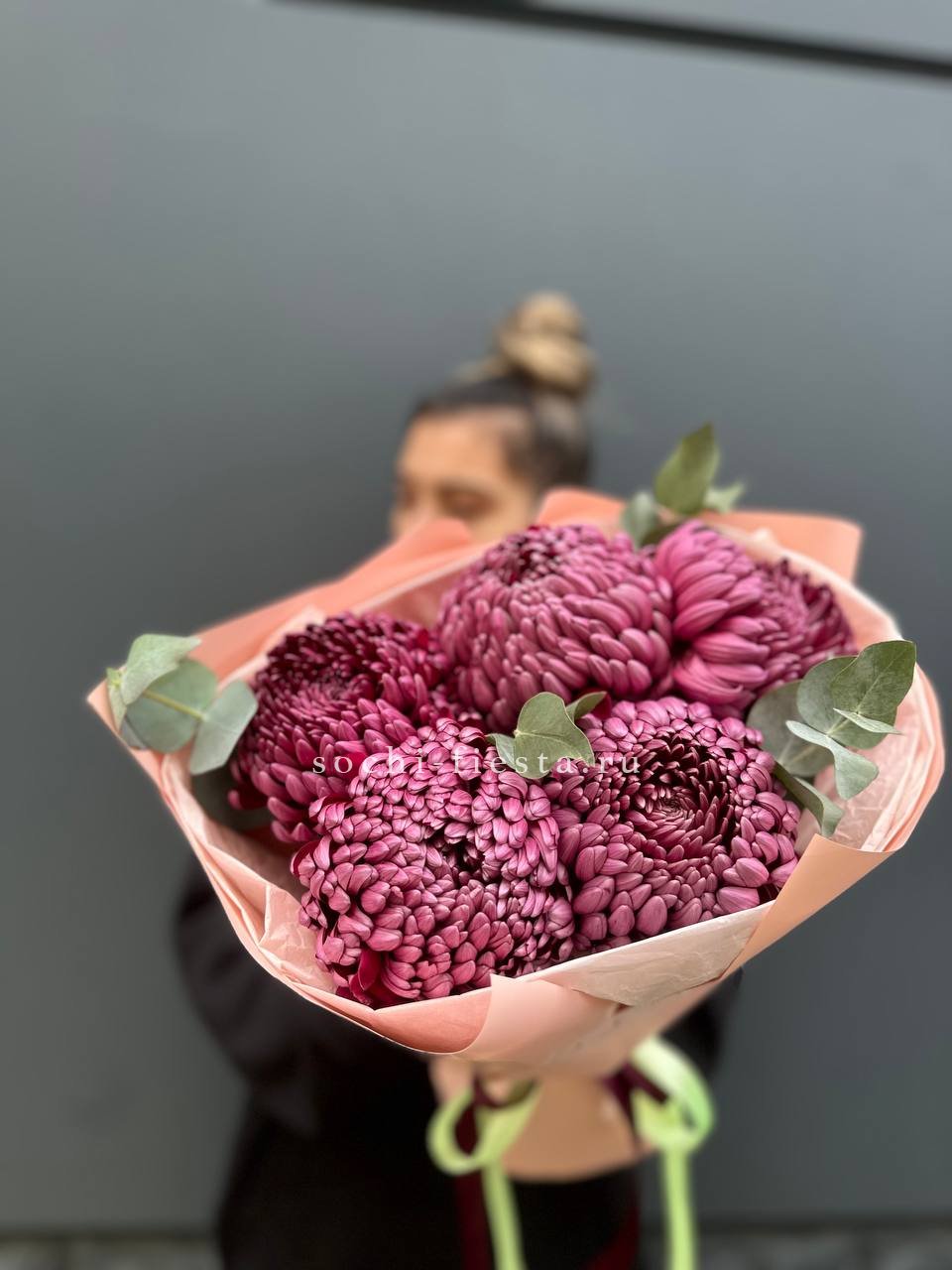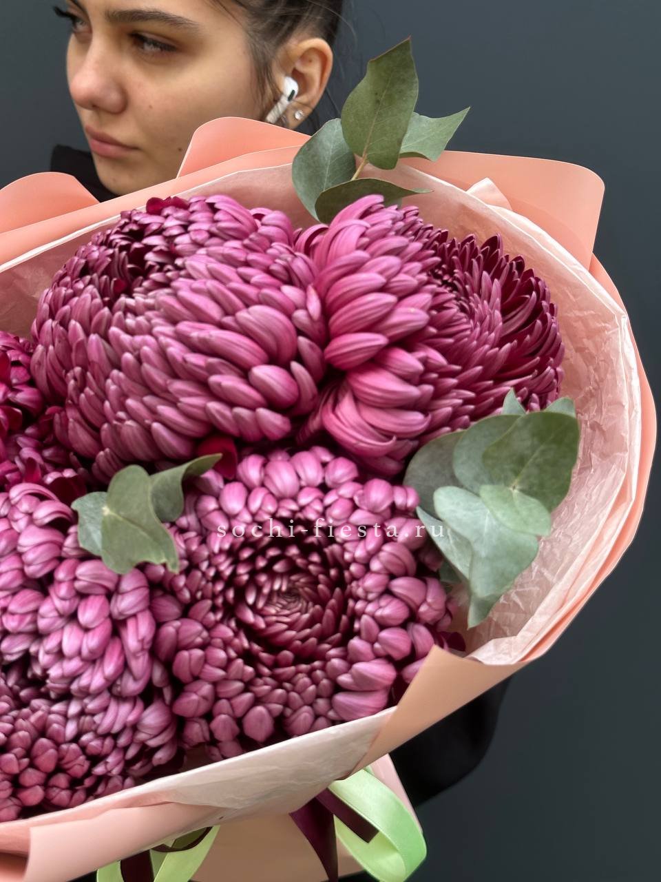 хризантемы Бигуди - 5, эвкалипт,  лента, дизайнерская упаковка.