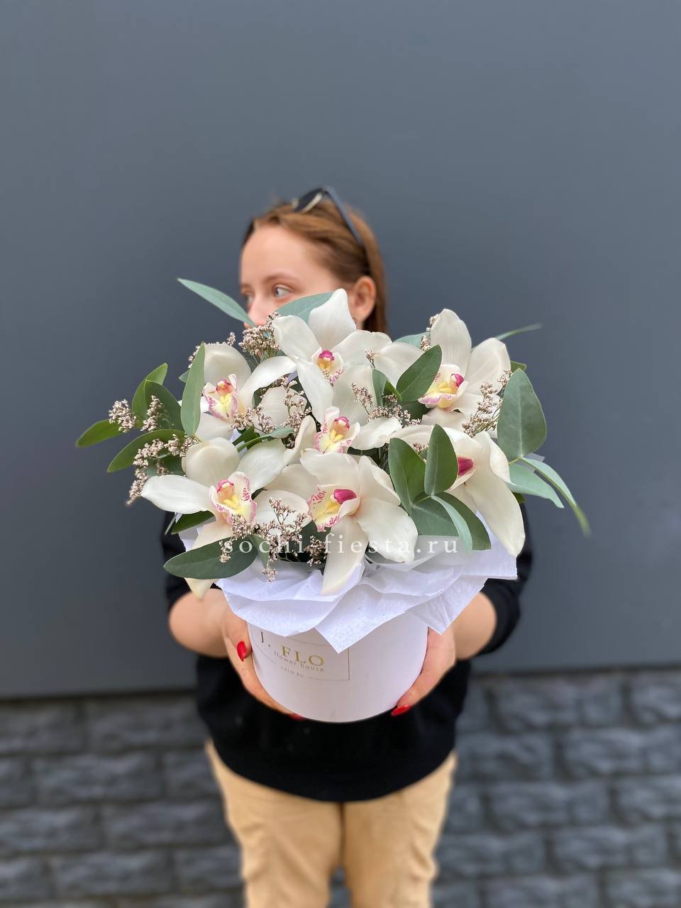 Цимбидиум в круглом боксе дополнен лимониумом и эвкалиптом. Композиция компактна, держит форму и долго сохраняет свежий вид.