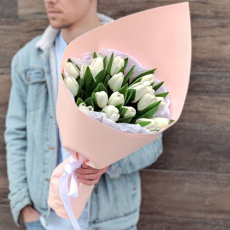 Девятнадцать тюльпанов с упругими закрытыми бутонами. Белые лепестки постепенно раскроются и покажут всю глубину цветка. Букет будет радовать свежестью несколько дней.