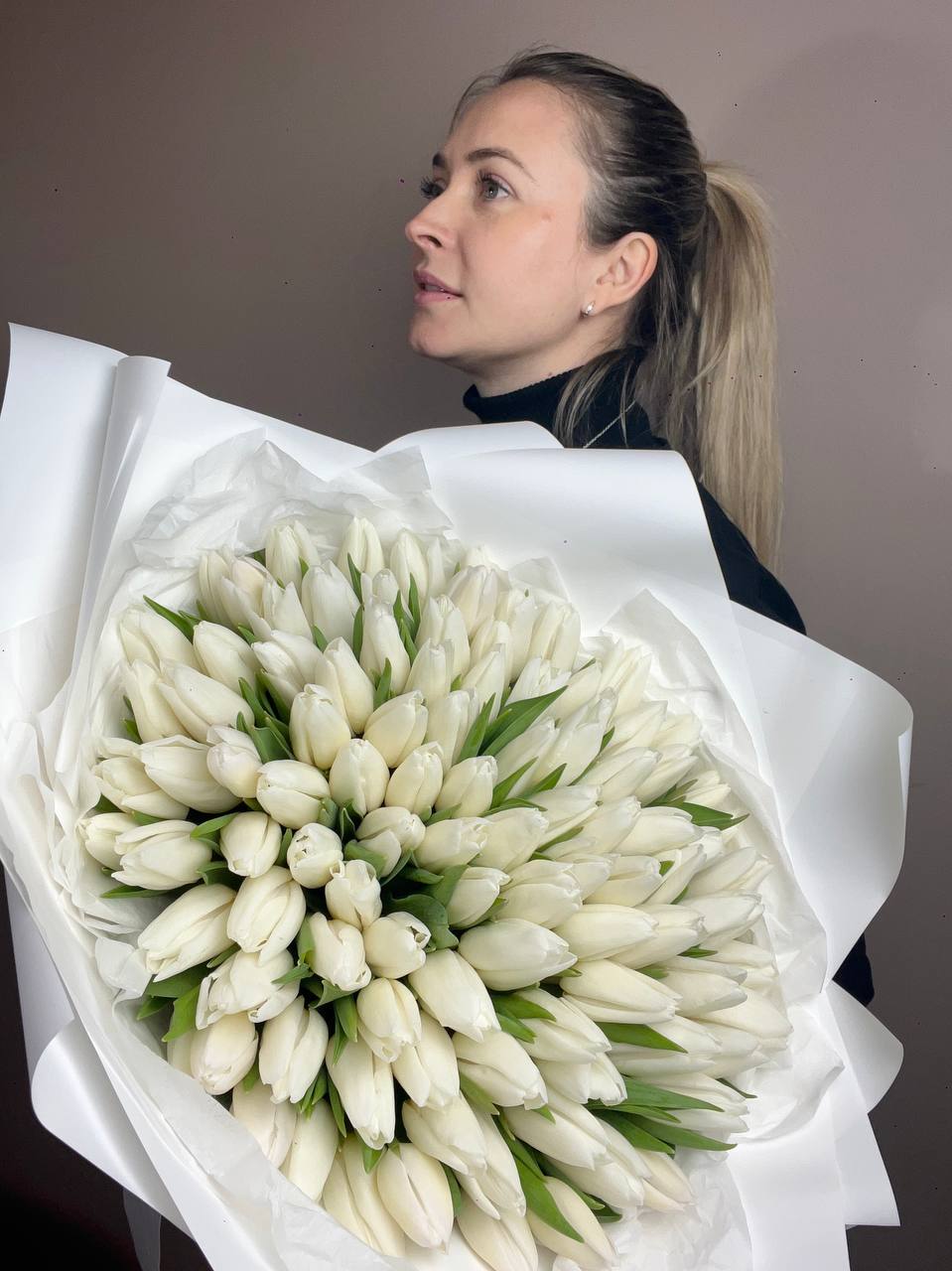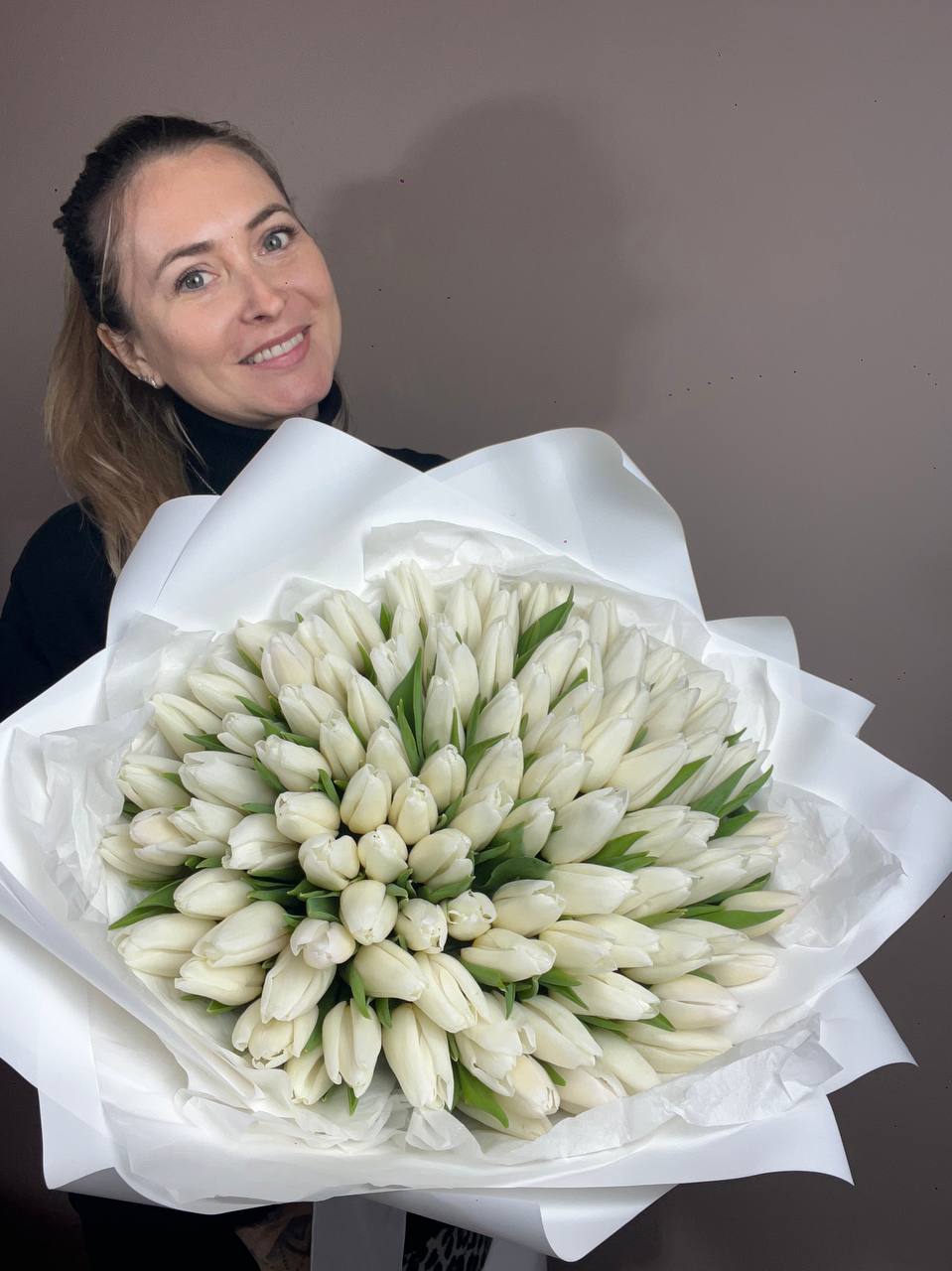 Двадцать пять пионовидных тюльпанов в лаконичной двухцветной обёртке. Белые бутоны с густыми лепестками держат форму и радуют свежестью несколько дней подряд.