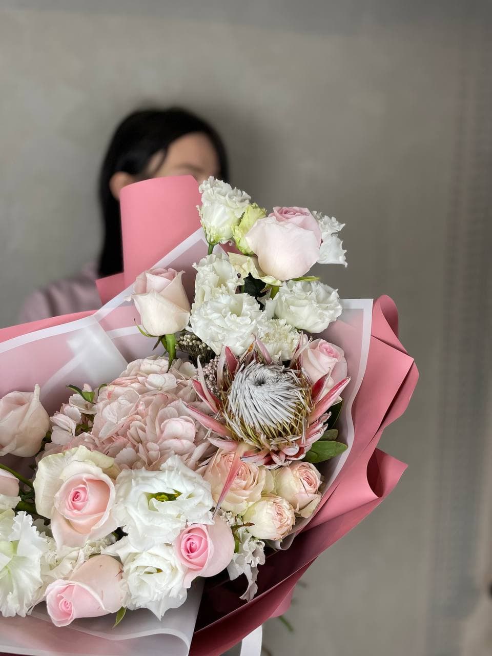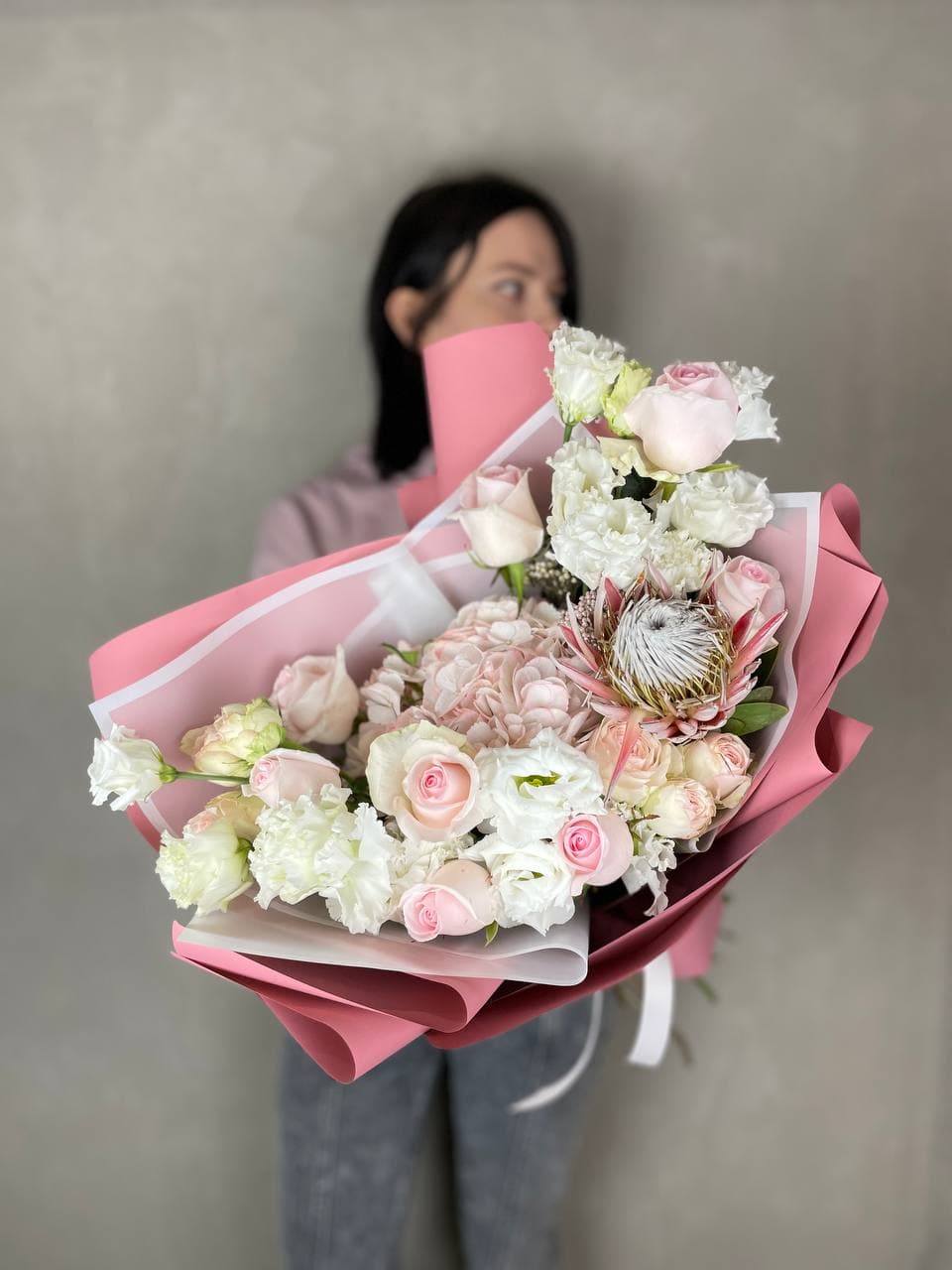 протея, роза кустовая, эустома, диантус, роза одноголовая, эвкалипт, озотамнус (по сезону) лента, дизайнерская упаковка.