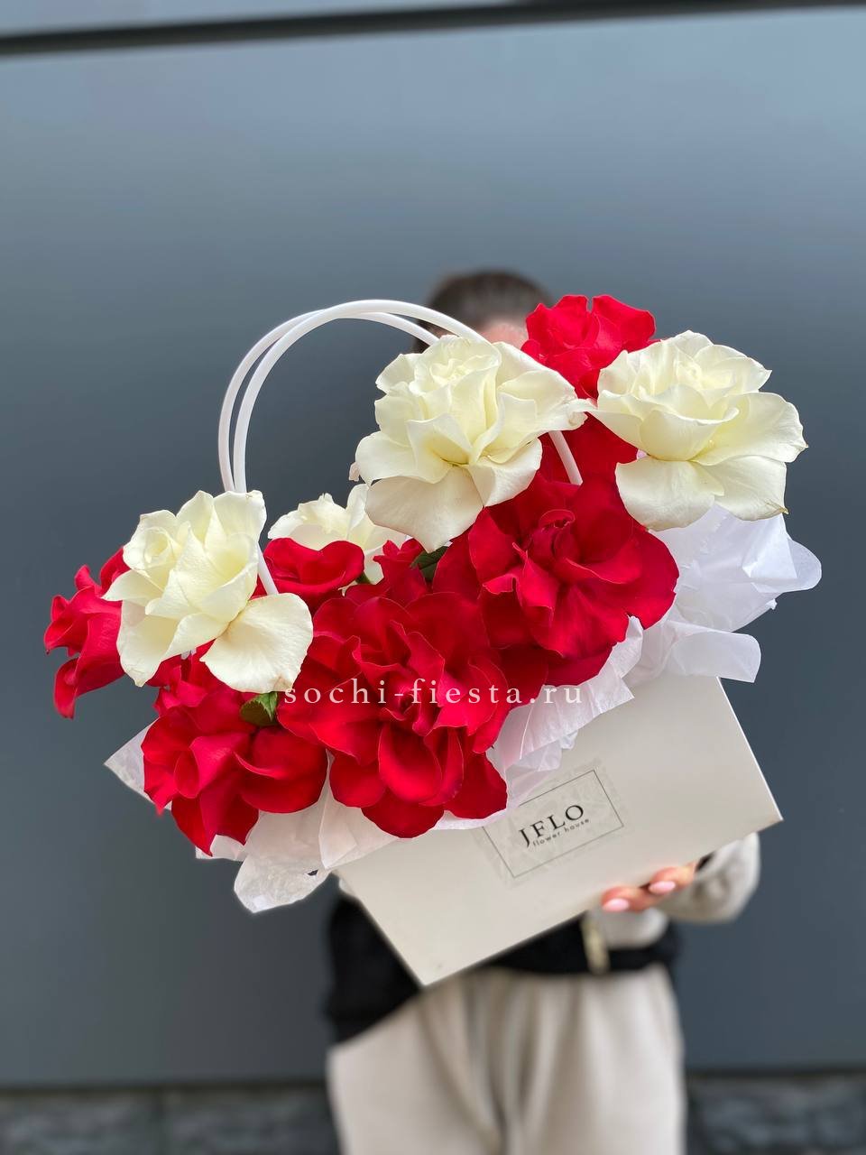 Сочетание вывернутых роз с гортензией, диантусами, розами, бомбастиками создает воздушных элегантный образ идеального цветочного подарка