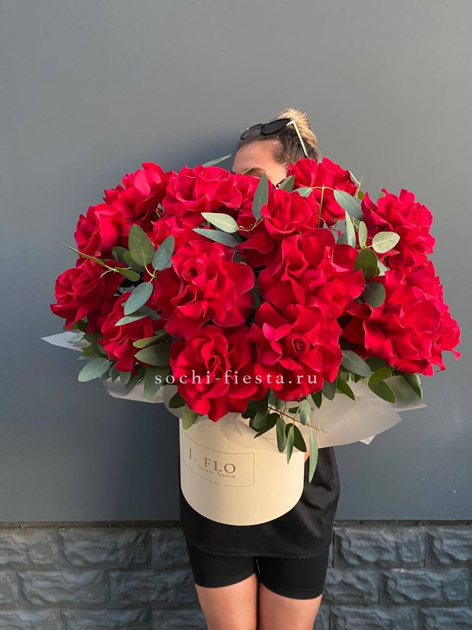 Розовые и алые головки роз собраны в плетёную корзину вместе с воздушной эустомой и серебристым эвкалиптом. Композиция держит форму и легко помещается на столе или комоде.