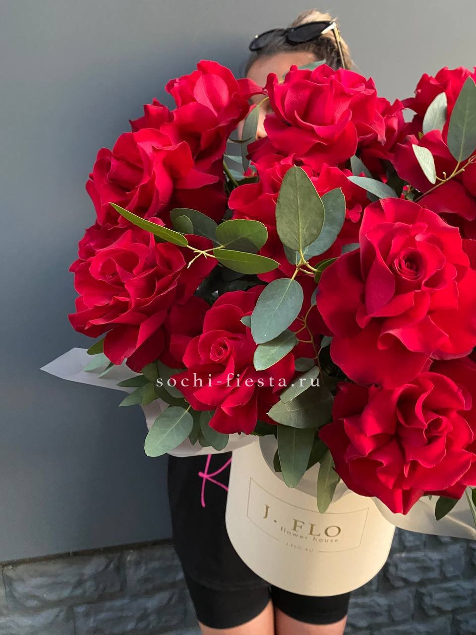 розовые розы, красная роза, эустома, эвкалипт, корзина малая.