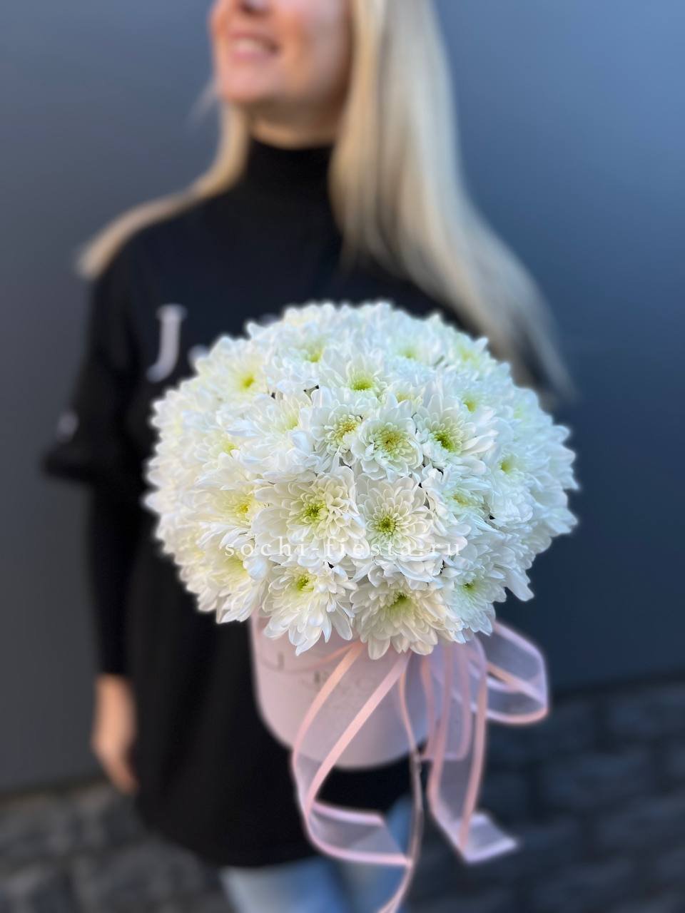 Хризантемы собраны в плотную округлую форму и помещены в аккуратный бокс. Компактное решение для рабочего стола или небольшой полки.