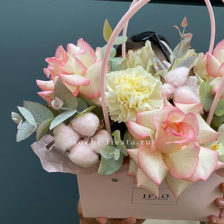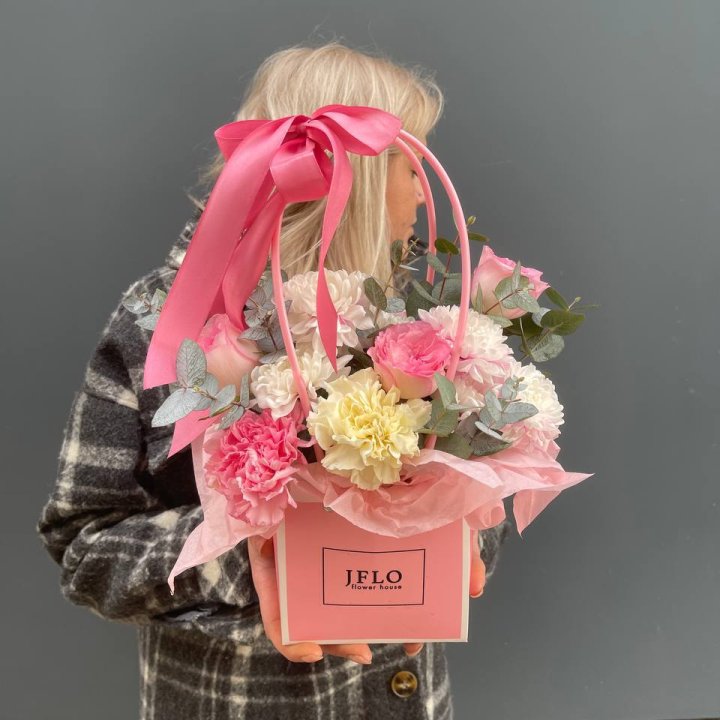 Коробка в студии Благовещенске — плотный картон с матовой поверхностью, иногда с тиснением логотипа. Внутри — флористическая губка (оазис), предварительно пропитанная водой. Сверху — атласная или шёлковая лента, декоративная тесьма, иногда фирменная открытка.