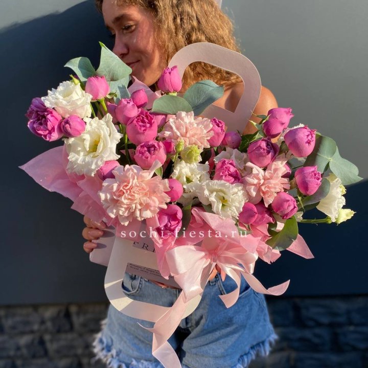 Размер выбирается по повод. Коллеге в Благовещенске — M или L. Юбилей родителей — XL. Выписка из роддома — L в пудровой палитре. Корпоративный юбилей — XXL. Романтический подарок — M или L в яркой палитре.