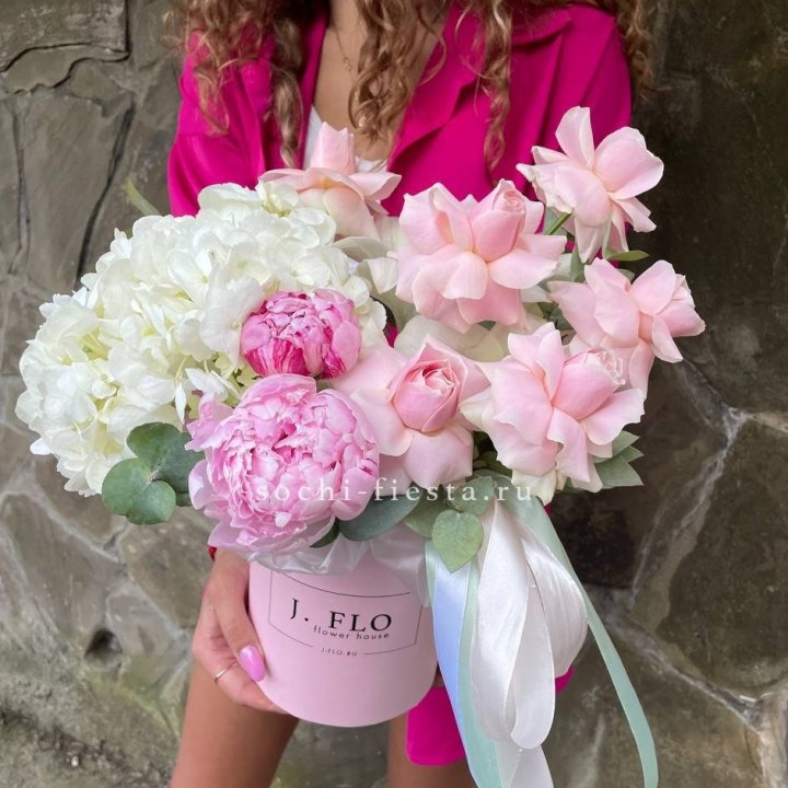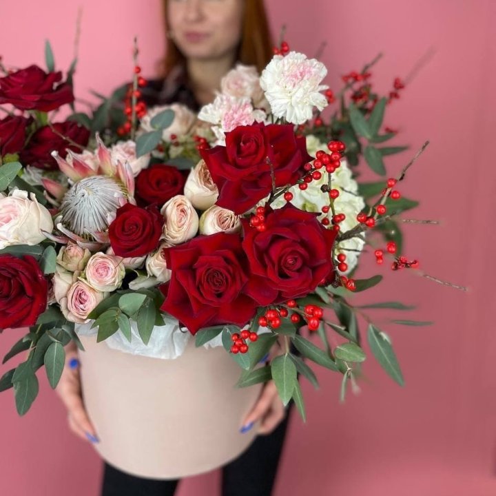 Наполнение подбирается под сезон. Зимой — амариллис, розы, ранункулюсы. Весной — тюльпаны, ранункулюсы, фрезия. Летом — пионы в мае-июне, гортензия в июле-августе. Осенью — хризантемы и декоративные травы.