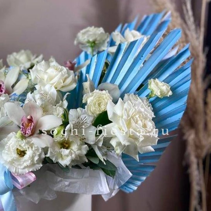 Коробка в студии Благовещенске — плотный картон с матовой поверхностью, иногда с тиснением логотипа. Внутри — флористическая губка (оазис), предварительно пропитанная водой. Сверху — атласная или шёлковая лента, декоративная тесьма, иногда фирменная открытка.