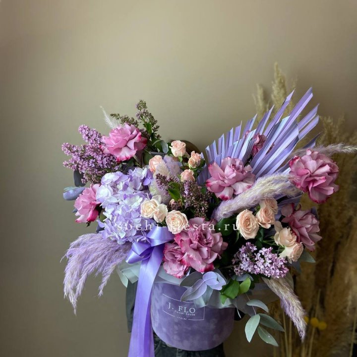 Наполнение подбирается под сезон. Зимой — амариллис, розы, ранункулюсы. Весной — тюльпаны, ранункулюсы, фрезия. Летом — пионы в мае-июне, гортензия в июле-августе. Осенью — хризантемы и декоративные травы.