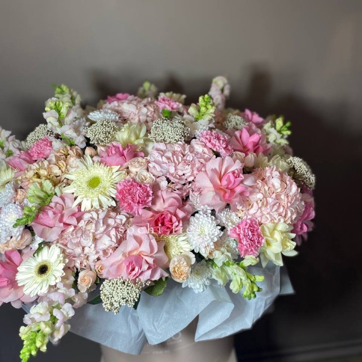 Наполнение подбирается под сезон. Зимой — амариллис, розы, ранункулюсы. Весной — тюльпаны, ранункулюсы, фрезия. Летом — пионы в мае-июне, гортензия в июле-августе. Осенью — хризантемы и декоративные травы.