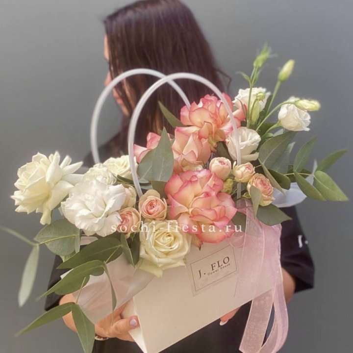 Коробка в студии Благовещенске — плотный картон с матовой поверхностью, иногда с тиснением логотипа. Внутри — флористическая губка (оазис), предварительно пропитанная водой. Сверху — атласная или шёлковая лента, декоративная тесьма, иногда фирменная открытка.