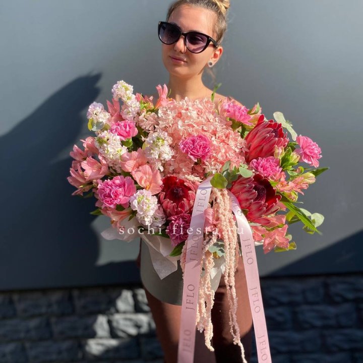 Размер выбирается по повод. Коллеге в Благовещенске — M или L. Юбилей родителей — XL. Выписка из роддома — L в пудровой палитре. Корпоративный юбилей — XXL. Романтический подарок — M или L в яркой палитре.