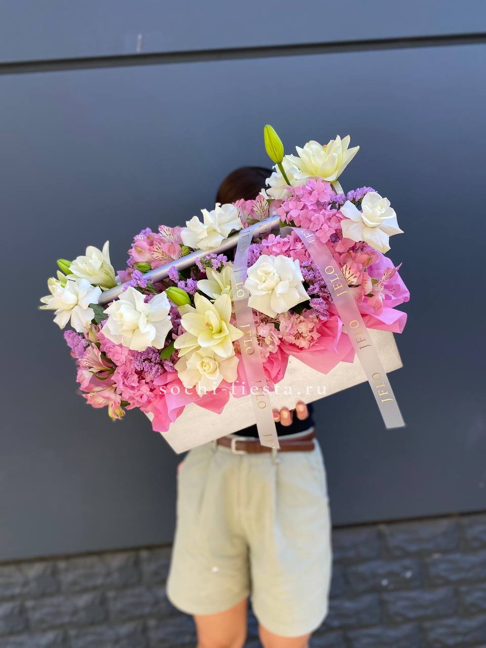 лилии, французские розы, гортензия, альстромерия, статица,деревянный ящик.