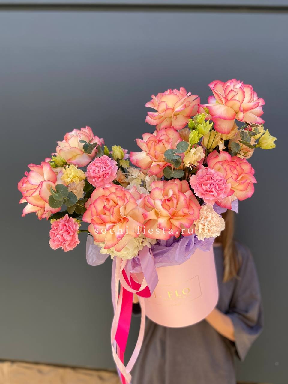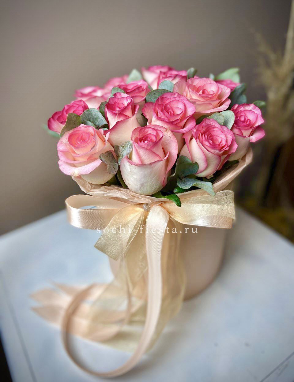 красная и розовая роза, озатамус, диантус, мисти баблс, эвкалипт, бокс 20.