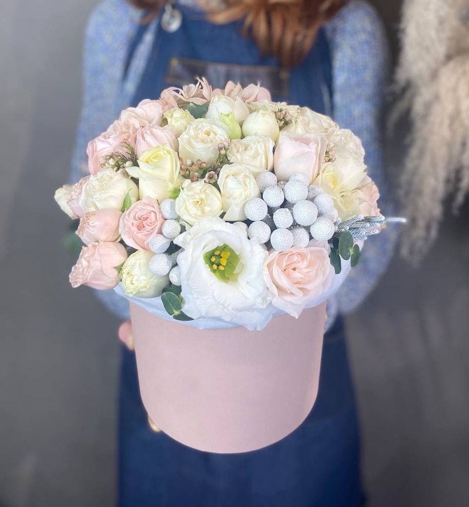 Пионы и гортензии наполняют композицию объемом и мягкой фактурой лепестков. Цилиндр собирает цветы в плотную форму, где каждый бутон находит свое место в общем движении.