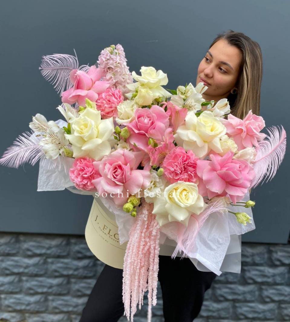 французские розы, альстромерии, маттиола, эустома, амарантус, перья.
