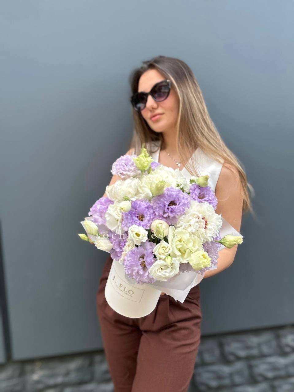 Эустома и пионы в цилиндре дают мягкое цветовое пятно с воздушной текстурой. Эвкалипт обрамляет композицию и добавляет свежую зелёную ноту общему впечатлению.