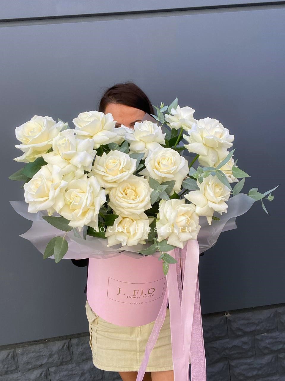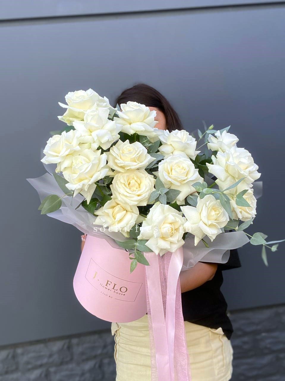 вывернутые белые розы, цилиндр D20, эвкалипт, лента, упаковка.