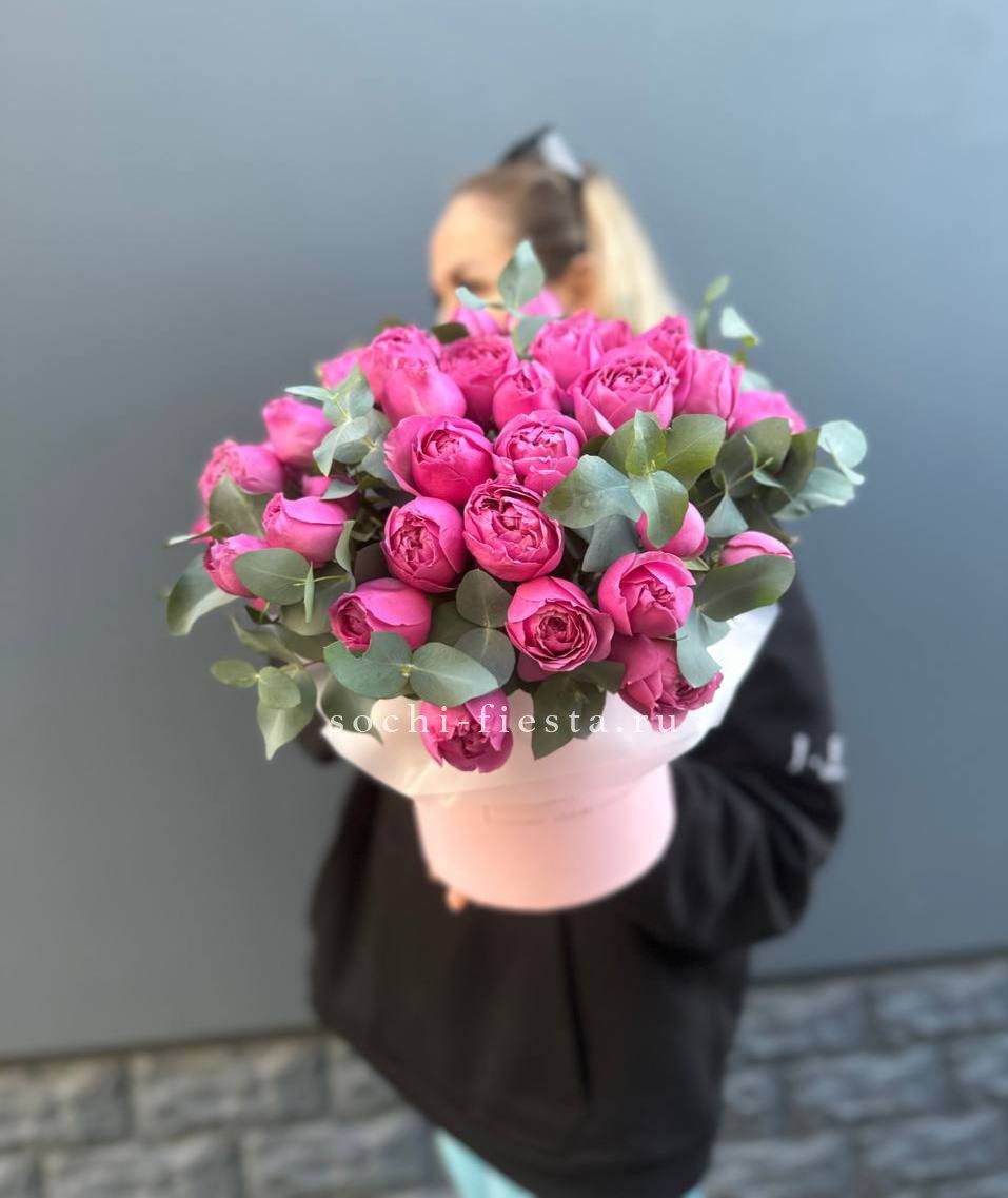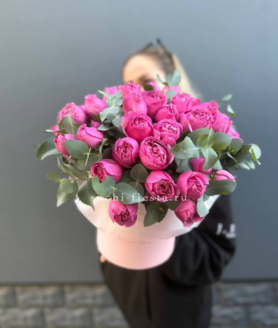 французские розы, кустовые розы джульетта, хлопок,  амарантус, зефирный цилиндр D13, эвкалипт, лента, упаковка.