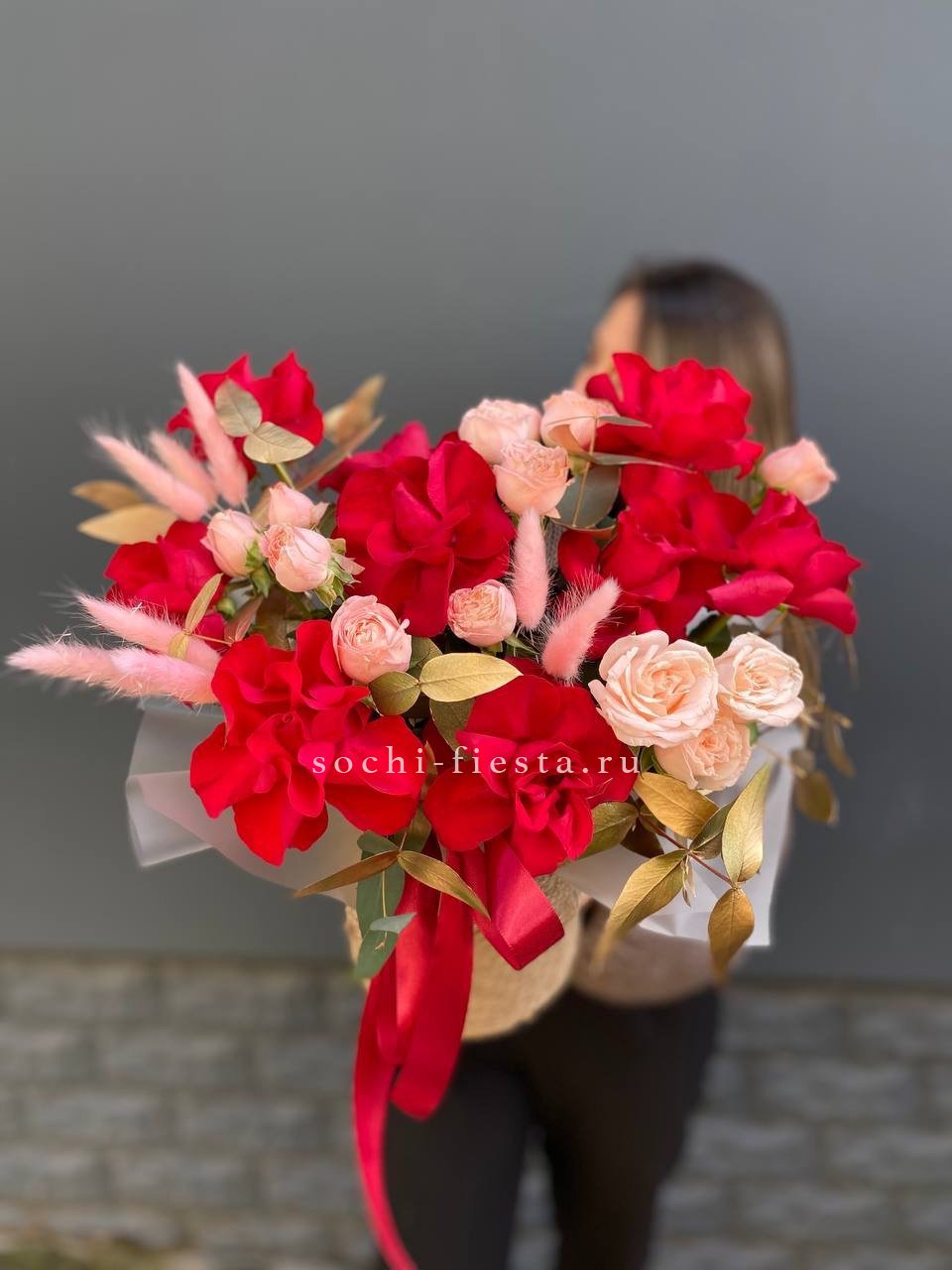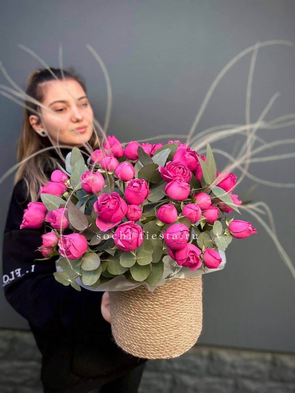 Французские розы теплого оттенка раскрываются в окружении эвкалипта и листьев Чико. Композиция в джутовом кашпо выглядит самодостаточно и гармонично вписывается в любое пространство.