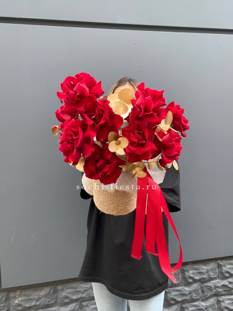 Воздушная гортензия окружает розы пудровых и снежных оттенков, а эвкалипт добавляет глубину и свежесть. Композиция собрана в натуральное джутовое кашпо, которое удобно разместить на столе или подоконнике.
