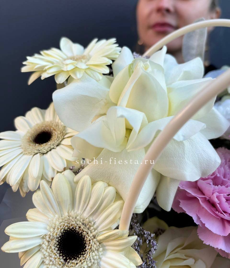 герберы , диантусы, белая роза, маттиола, хризантема кустовая, лента, сумка-кашпо.