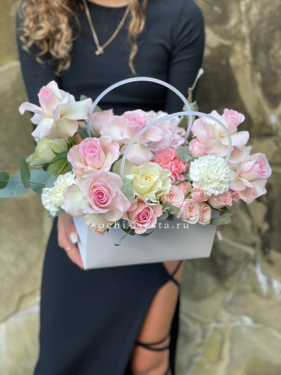 пионовидные кустовые розы, альстромерии, сумочка, лента.