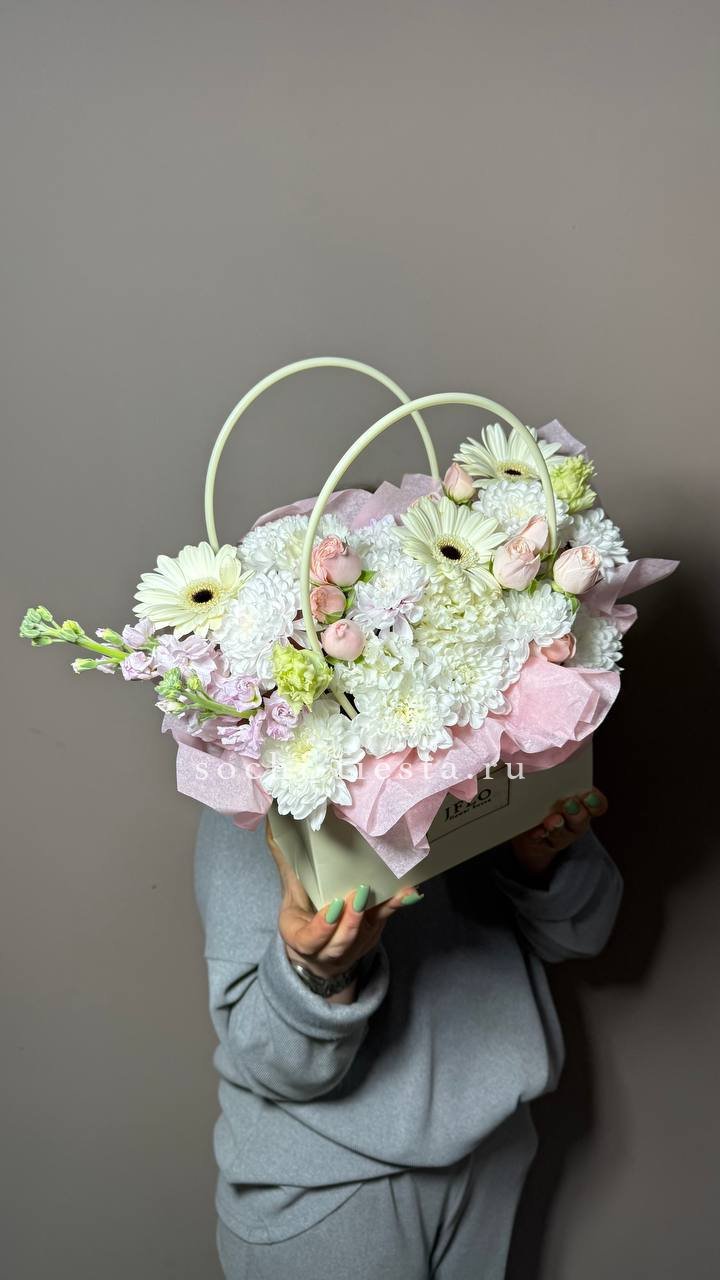 Хризантемы и маттиола собраны в компактную форму с лиловыми переливами. Статица добавляет воздушности, а сумочка делает композицию мобильной и готовой к вручению. Цветы закреплены в оазисе для длительной свежести.