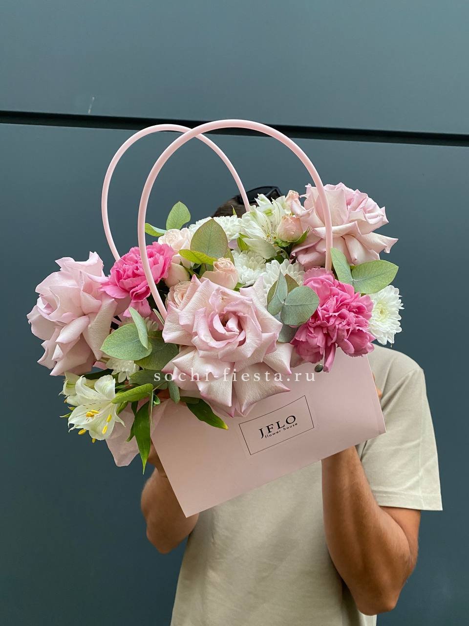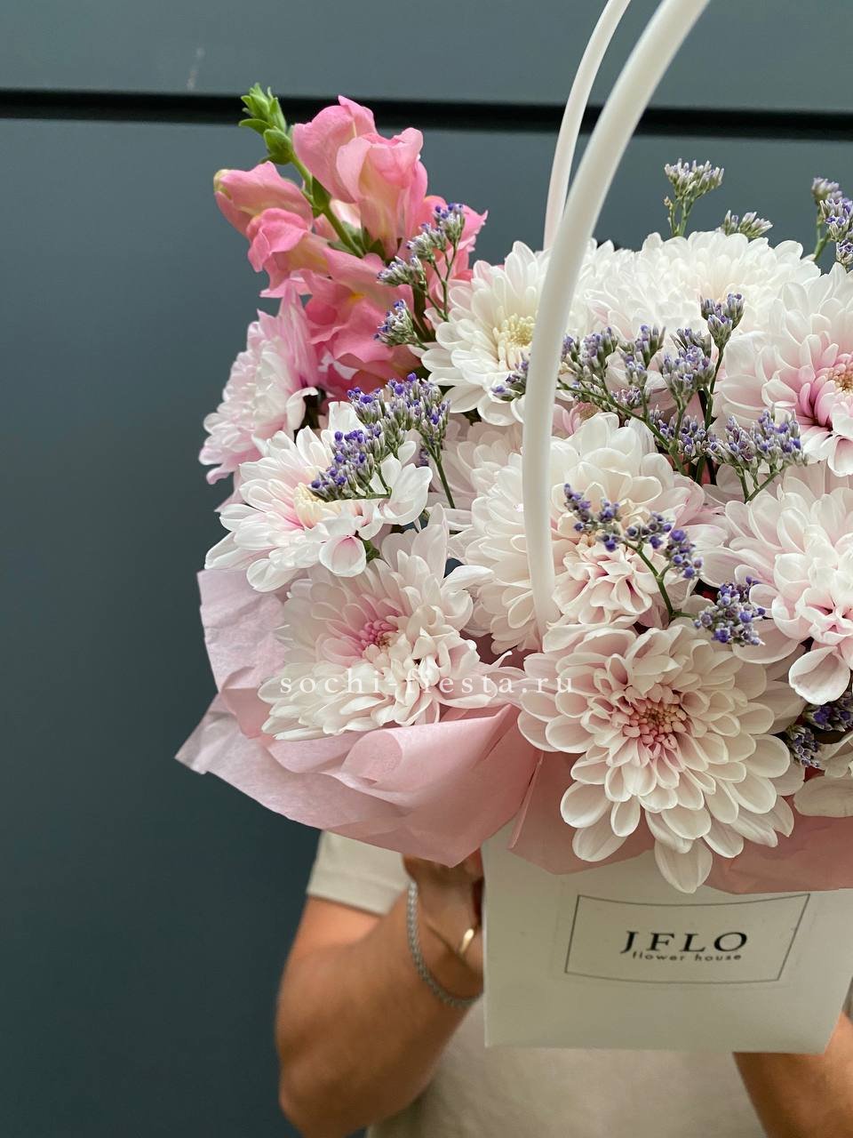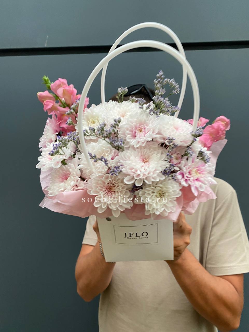 джумилия, гербера, мисти баблс, диантус, хлопок, лагурус, сумочка.