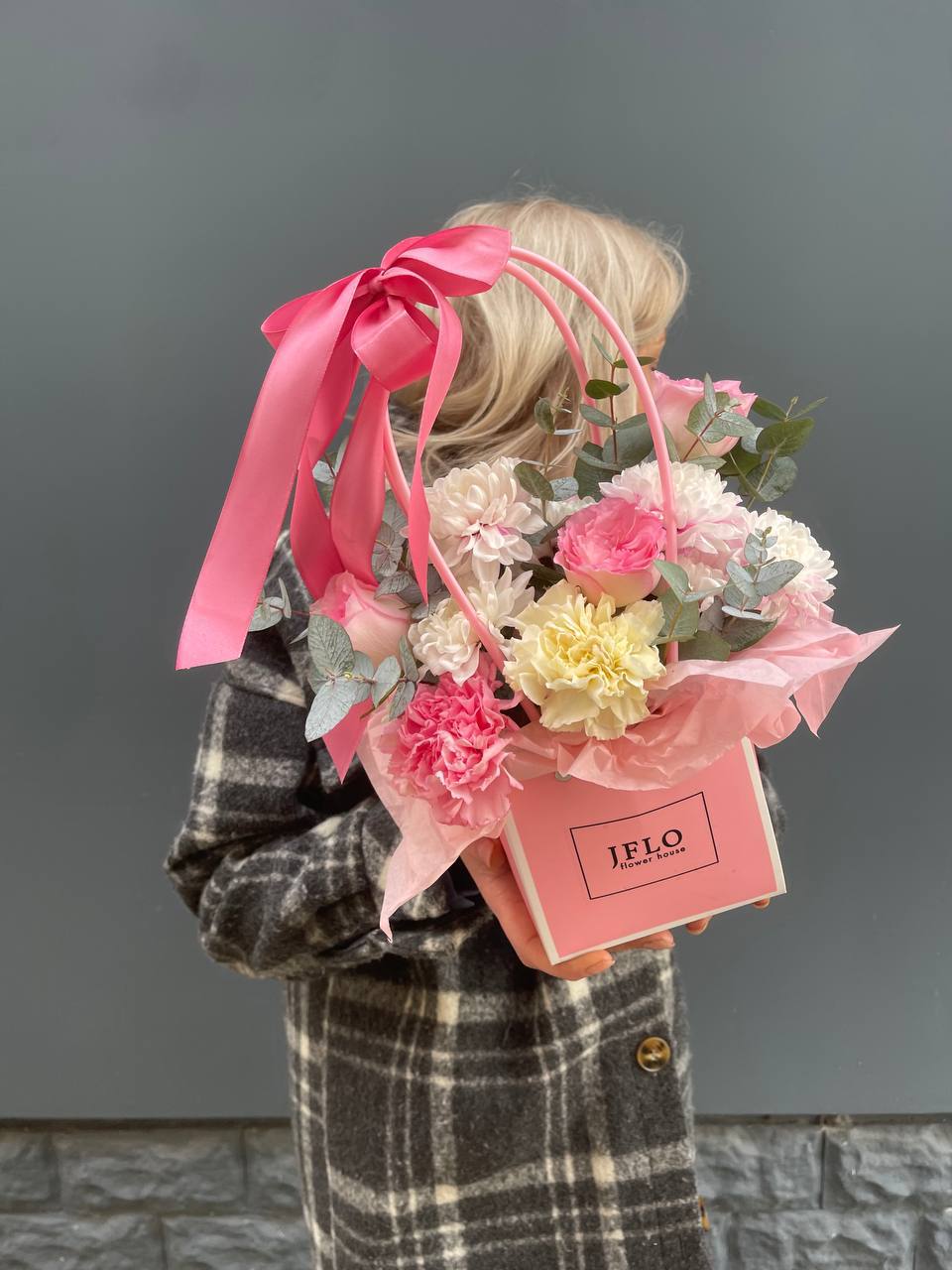 Миниатюрная композиция в удобной сумочке сочетает пышные головки хризантем с бархатистыми розами и воздушным диантусом. Веточки эвкалипта добавляют свежести, а компактная форма позволяет разместить цветы на рабочем столе или прикроватной тумбе.