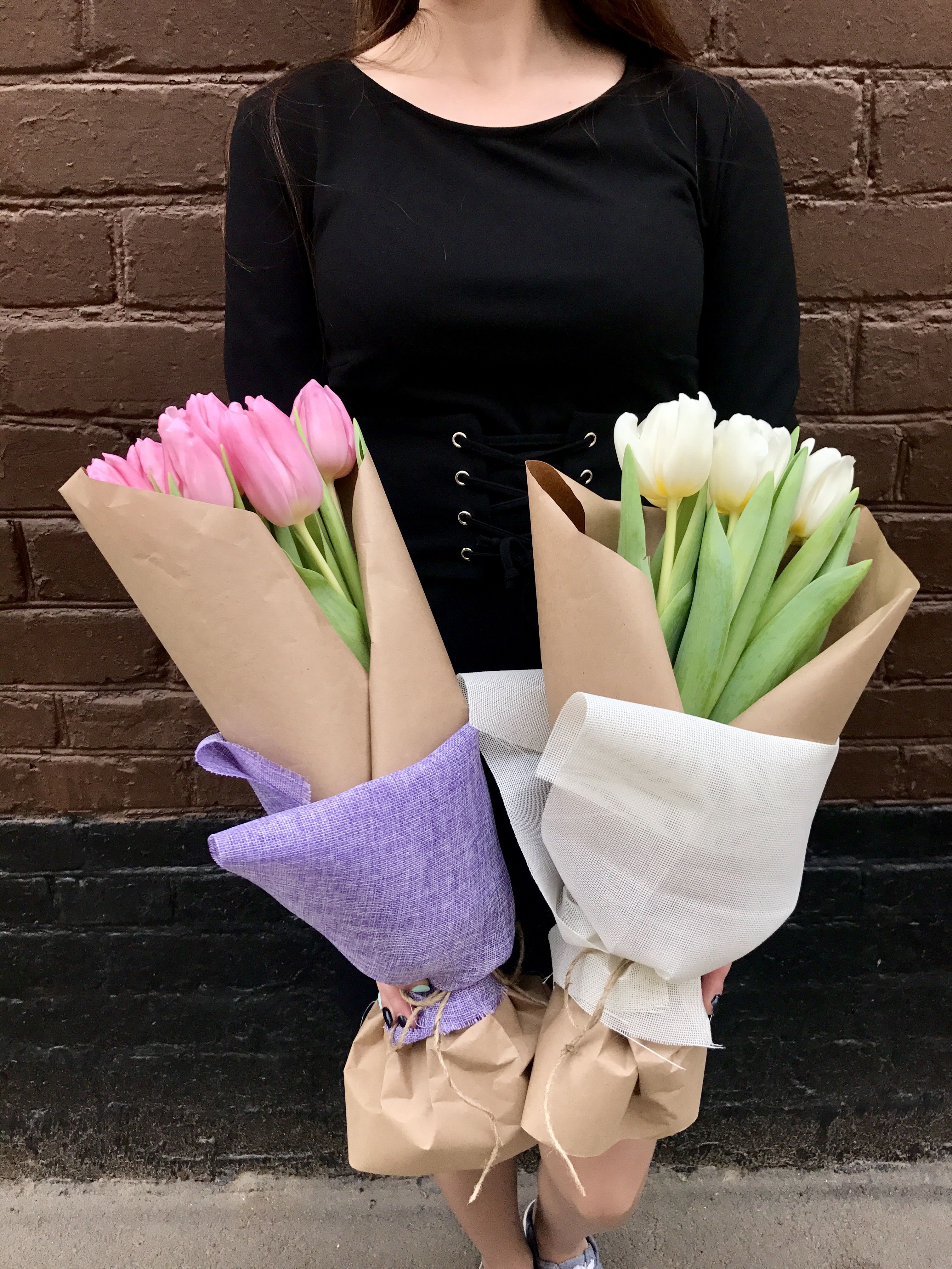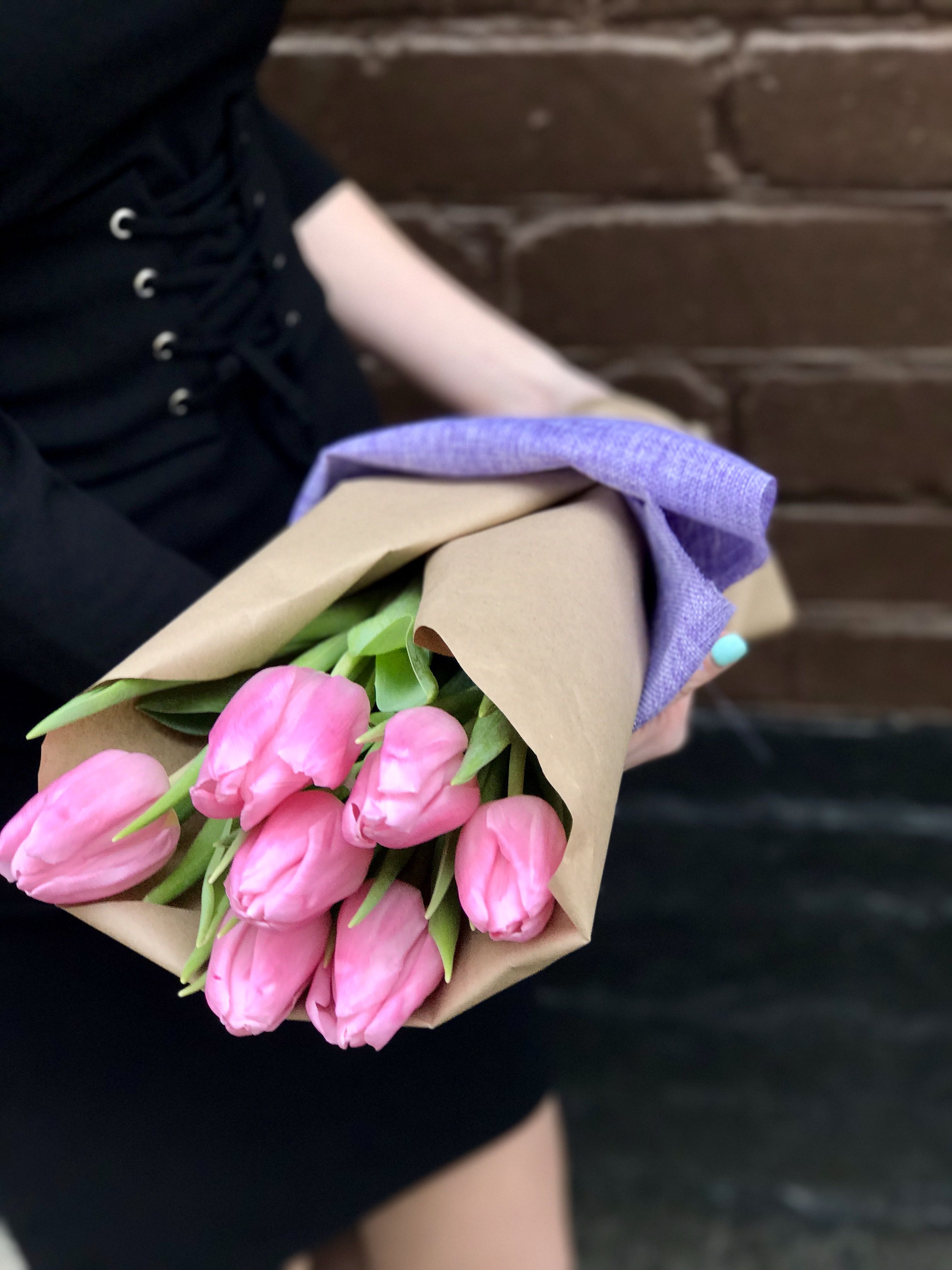 7 розовых тюльпанов, лента, крафт и мешковина. Данная цена доступна при единовременном заказе от 10 шт.