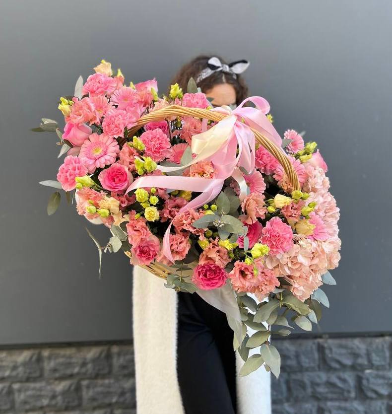 65 пионовидных кустовых роз Misty Bubbles, эвкалипт, светлая корзина.