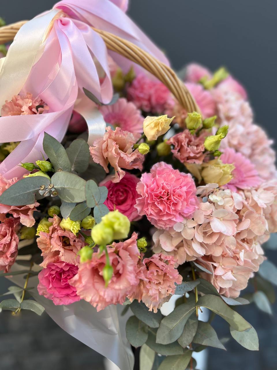 Корзина с шестьюдесятью пятью кустовыми розами Мисти Бабблс создаёт плотное облако из махровых бутонов лавандового оттенка. Эвкалипт добавляет свежести и завершает композицию.